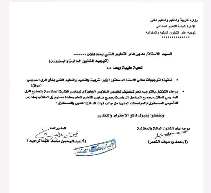 وأكدت وزارة التربية والتعليم في خطاب رسمي للمديريات التعليمية، ضرورة تكليف تخصص الملابس الجاهزة في المدارس الفنية الصناعية، بتصنيع الزي المدرسي لمدارس التعليم العام وكذا تصنيع زي الطلاب بالمواصفات المقررة، وذلك تنفيذا لتوجيهات الدكتور رضا حجازي بشأن الزي المدرسي.