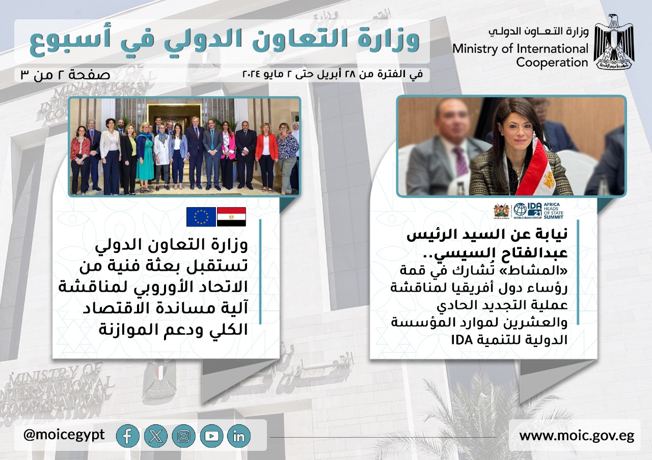 وزيرة التعاون الدولي تُشارك في قمة المؤسسة الدولية للتنمية IDA بكينيا.. والاجتماع الخاص للمنتدى الاقتصادي العالمي بالرياض.. وتستقبل بعثة الاتحاد الأوروبي رفيعة المستوى لبحث خارطة طريق التعاون