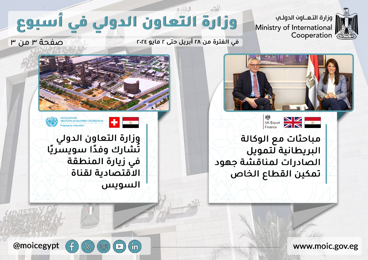 شاركت وزارة التعاون الدولي في الزيارة الميدانية التي تم تنظيمها من قبل سفارة سويسرا بالقاهرة ومنظمة الأمم المتحدة للتنمية الصناعية (اليونيدو)، للمنطقة الاقتصادية لقناة السويس والمجمع الصناعي لشركة أوراسكوم المقام في المنطقة الاقتصادية، لمتابعة آخر تطورات برنامج المناطق الصناعية الصديقة للبيئة الذي تنفذه منظمة اليونيدو بتمويل من الحكومة السويسرية داخل المنطقة الاقتصادية لقناة السويس، من خلال المطور الصناعي أوراسكوم.