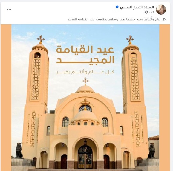 وقالت السيدة انتصار السيسي، في منشور لها عبر صفحتها الرسمية بموقع التواصل الاجتماعي فيسبوك: كل عام وأقباط مصر جميعا بخير وسلام بمناسبة عيد القيامة المجيد.