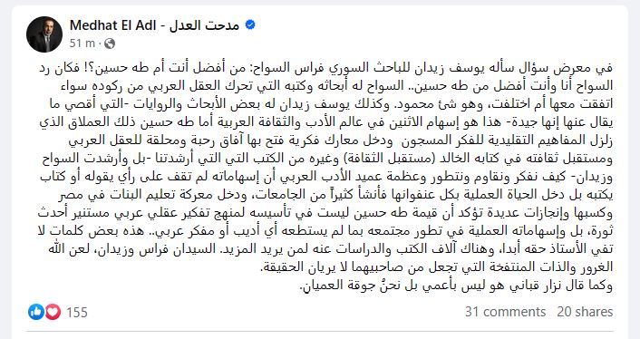 شن الكاتب والروائي مدحت العدل هجوما على الكاتب يوسف زيدان ونظيره السوري فراس السواح، بسبب التطاول على عميد الأدب العربي طه حسين، واعتبارهما أفضل من طه حسين.