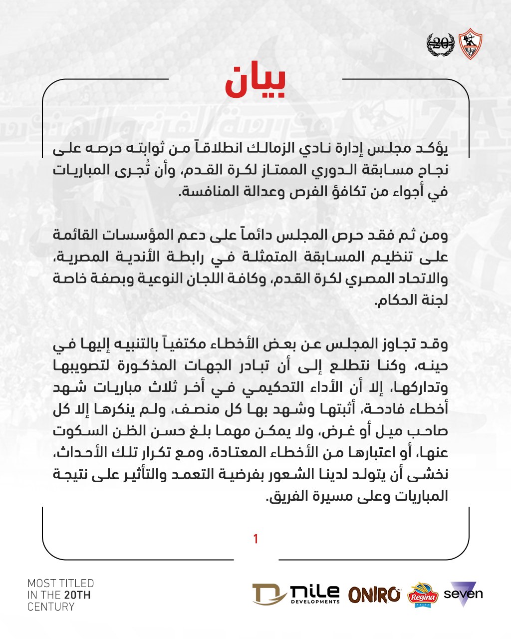 "مجلس إدارة نادي الزمالك انطلاقا من ثوابته يؤكد حرصه علي نجاح مسابقه الدوري العام لكره القدم وان تجري المباريات في اجواء من تكافؤ الفرص وعداله المنافسه ، ومن ثم فقد حرص المجلس دائما علي دعم المؤسسات القائمه علي تنظيم المسابقه المتمثله في رابطه الانديه المصريه واتحاد الكرة وكافه اللجان النوعيه وبصفه خاصه لجنه الحكام".