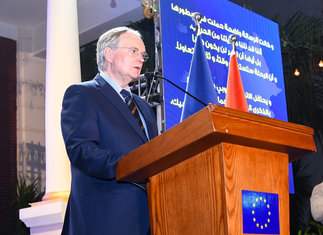 وفي نهاية كلمته، ودع السفير كريستيان بيرجر، رئيس البعثة الدبلوماسية للاتحاد الأوروبي بالقاهرة، ضيوف الحفل، معلنا انتهاء فترة عمله في مصر، معربا عن سعادته بتواجده على مدار 4 سنوات بالقاهرة، والعمل على تعزيز العلاقات الثنائية بين الطرفين في مختلف المجالات، ورغم حزنه على مغادرته للبلاد، إلإ أنه سيظل داعما لمصر من منبر الاتحاد الأوروبي في بروكسل، متمنيا لمصر مواصلة النجاح والتقدم وصنع المستقبل المتميز.