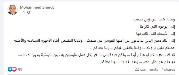 وقال شردي في تدوينة له على صفحته الشخصية على فيس بوك : “رسالة هامة في زمن صعب.. إلى الوجوه التي لانراها.. إلى الأسماء التي لانعرفها.. إلى أبناء مصر الذين يدافعون عن امنها القومي في صمت… ولادنا الطيبين أبناء الأجهزة السيادية والأمنية”