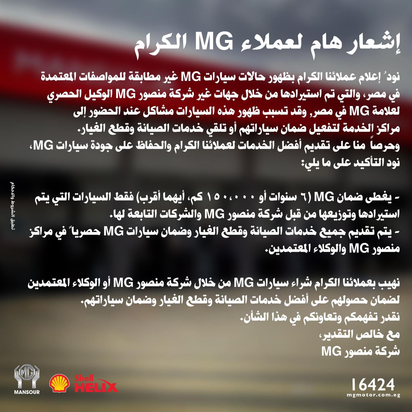 وأكد البيان الذي نشرته MG عبر صفحتها الرسمية على موقع التواصل الاجتماعي "فيس بوك": «نود إعلام عملائنا الكرام بظهور حالات سيارات MG غير مطابقة للمواصفات المعتمدة في مصر، والتي تم استيرادها من خلال جهات غير شركة منصور MG، الوكيل الحصري للعلامة في مصر، وقد تُسبب ظهور هذه السيارات مشاكل عند الحضور إلى مراكز الخدمة لتفعيل ضمان الخاصة بها، أو تلقي خدمات الصيانة وقطع الغيار».