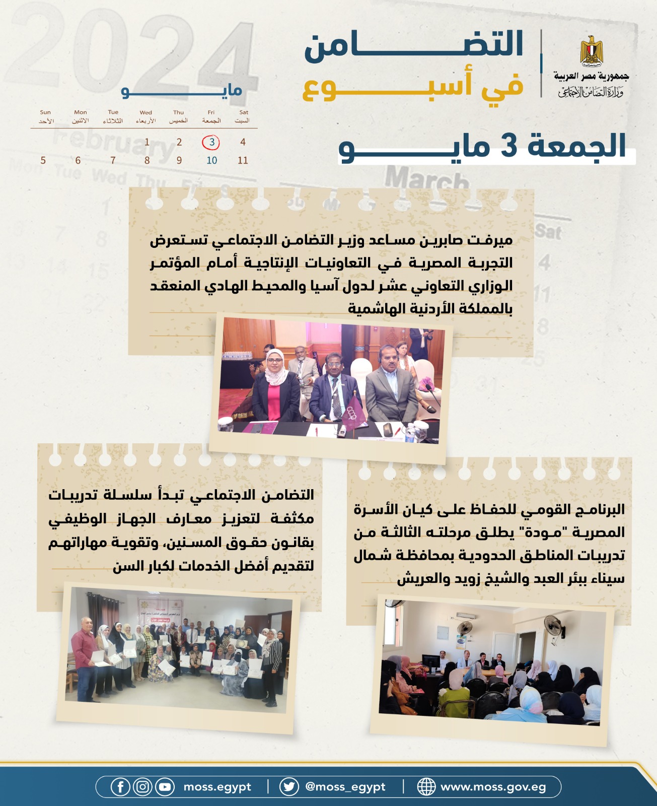 - وزارة التضامن الاجتماعي تبدأ تدريبات الرائدات الاجتماعيات علي برنامج الألف يوم الأولي بالشراكة مع برنامج الأغذية العالمي للتوعية الغذائية لحوالي مليون أسرة من خلال الزيارات المنزلية والندوات.