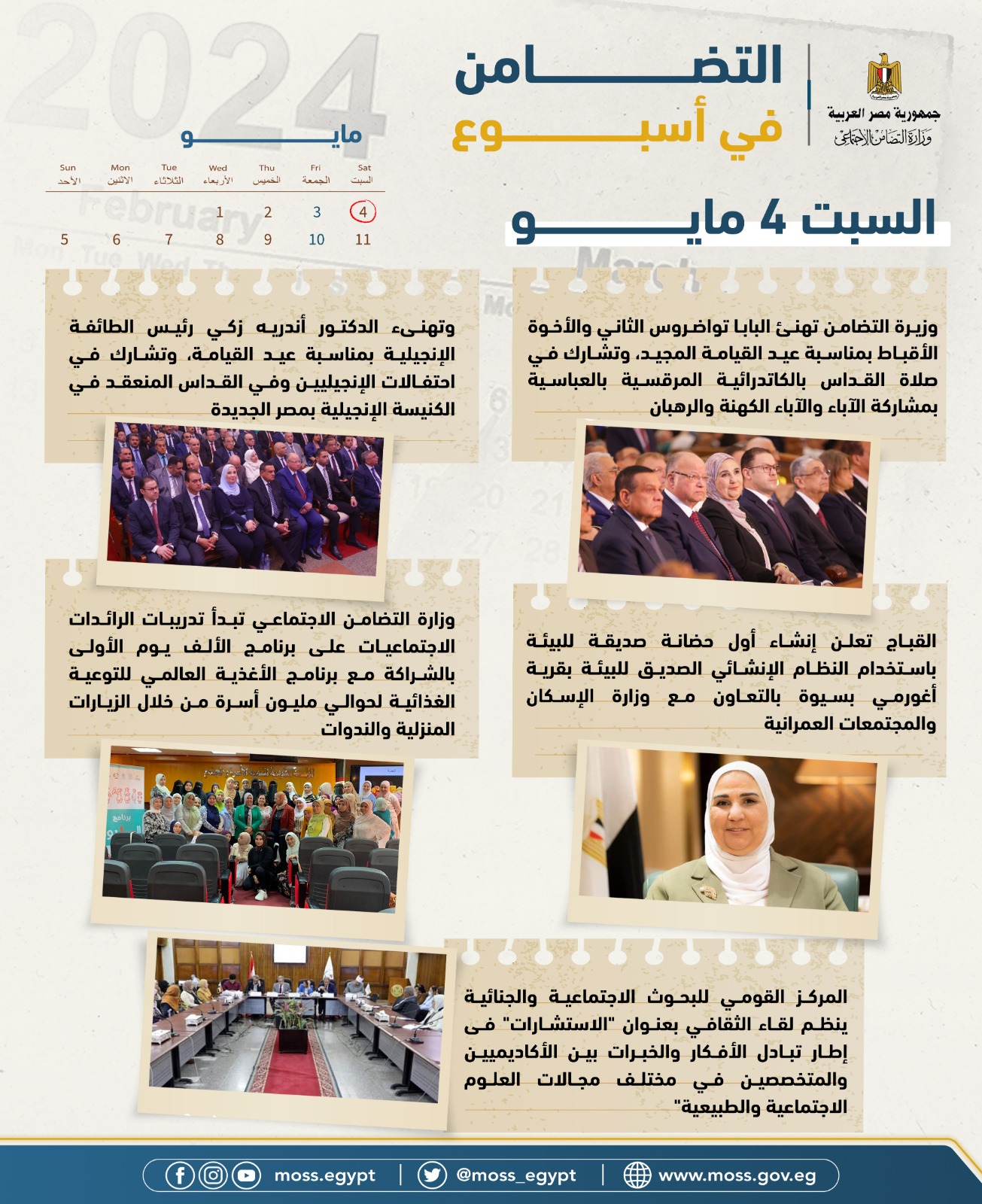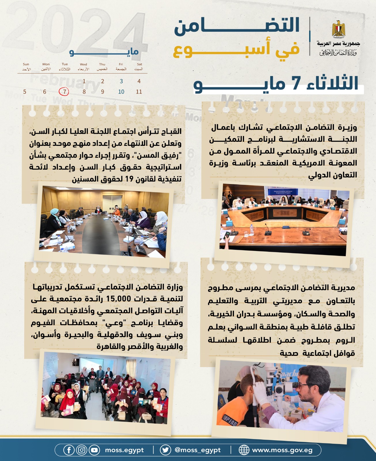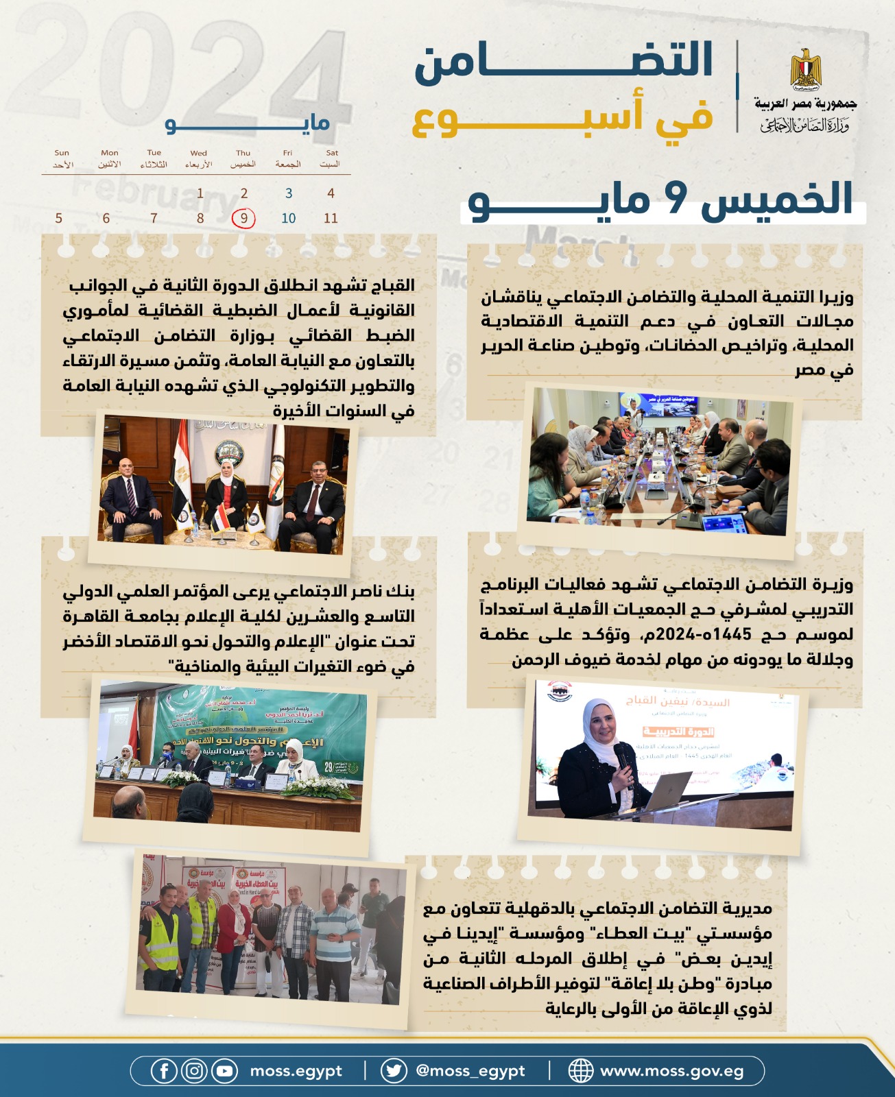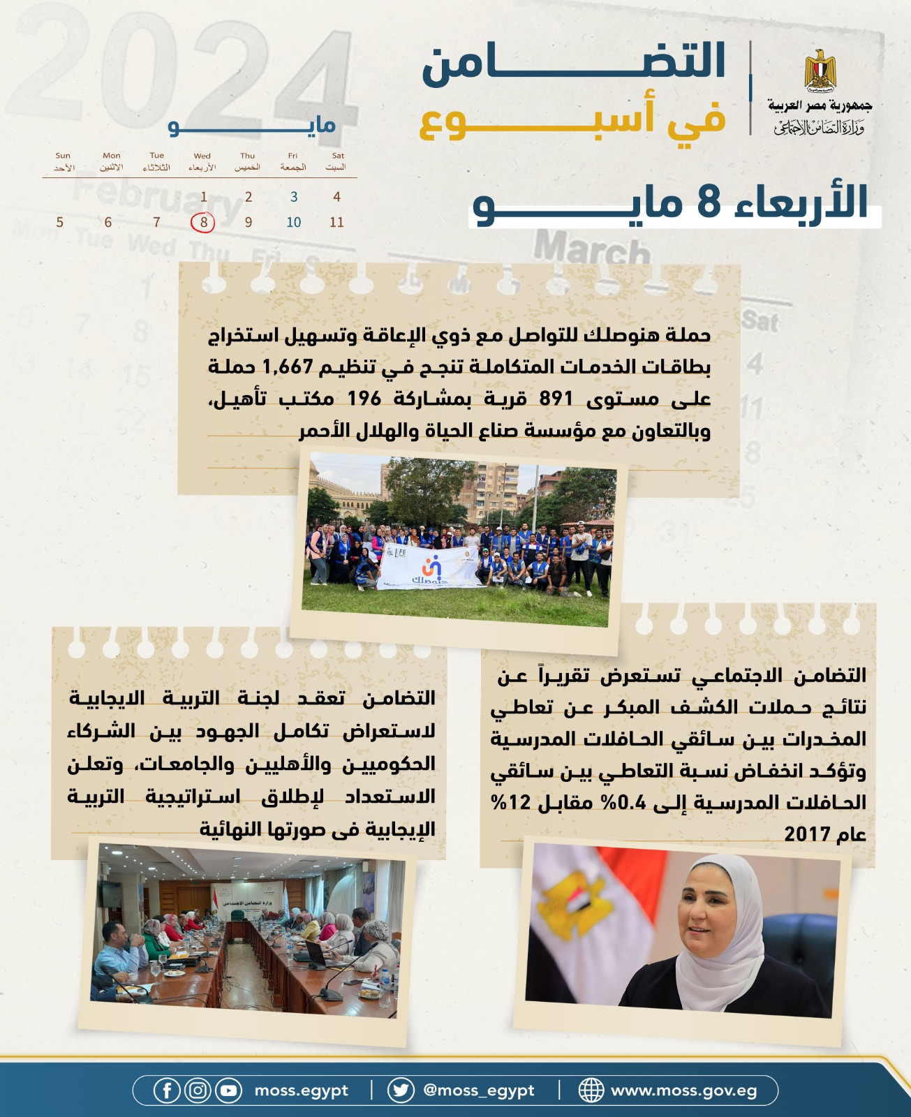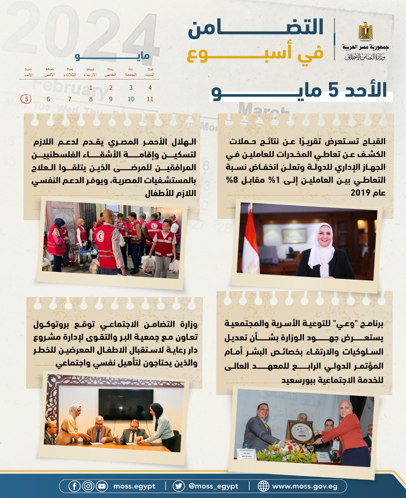 أصدرت وزارة التضامن الاجتماعي تقريرها الأسبوعي بالإنفوجراف والفيديو، حيث تستعرض من خلاله الأنشطة والأحداث، التي قامت بها الدكتورة نيفين القباج وزيرة التضامن الاجتماعي، وكذلك قطاعات الوزارة المختلفة خلال الفترة من 3 مايو إلى 9 مايو.