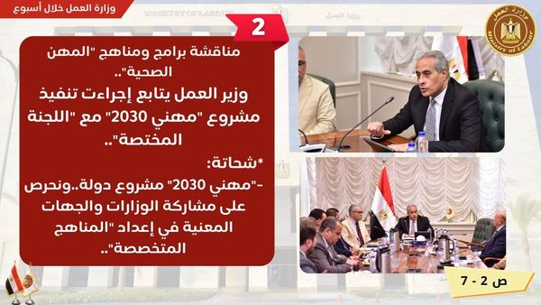 ..وأكد حسن شحاتة وزير العمل أن مناقشة البرامج والمناهج التدريبية الخاصة بمشروع "مهني 2030"،مع شركاء العمل والتنمية من الوزارات المعنية ،يؤكد حرص وزارة العمل على مشاركة جميع الجهات المختصة في هذا المشروع التدريبي الذي أطلقته وزارة العمل منتصف يناير الماضي بالتعاون مع القطاع الخاص،تحت رعاية دولة رئيس مجلس الوزراء د. مصطفى مدبولي ،لتدريب مليون مُتدرب سنويًا على المِهن التي يحتاجها سوق العمل في الداخل والخارج،وأوضح الوزير أن حرص الوزارة على مشاركة الجميع في نجاح هذا المشروع ،يؤكد عقيدتها الراسخة بأنه "مشروع دولة " تحرص الوزراة من خلاله تنمية مهارات الشباب ،وتقنين أوضاع المراكز الخاصة ،وتقديم مناهج تدريبية تتماشى مع المتغيرات والتحديات التي تواجه سوق العمل في الداخل والخارج ،لتنفيذ توجيهات السيد الرئيس عبدالفتاح السيسي رئيس الجمهورية ..جاء ذلك خلال لقاء الوزير شحاتة -بمقر الوزارة بالعاصمة الإدارية الجديدة- مع اللجنة الإستثنائية المُختصة بتنفيذ مشروع مهني 2030،التي إجتمعت لبحث ومناقشة ومراجعة وإبداء الرأى فى مجموعة من البرامج والمناهج المتخصصة المُرتبطة بملف الصحة ، تمهيداً لإعتمادها من لجنة الخبراء والمختصين الصادر بها القرار الوزارة رقم 178 لسنة 2023 ، والتي سيتم تدريسها للمُتدربين في مشروع" مهني 2030".