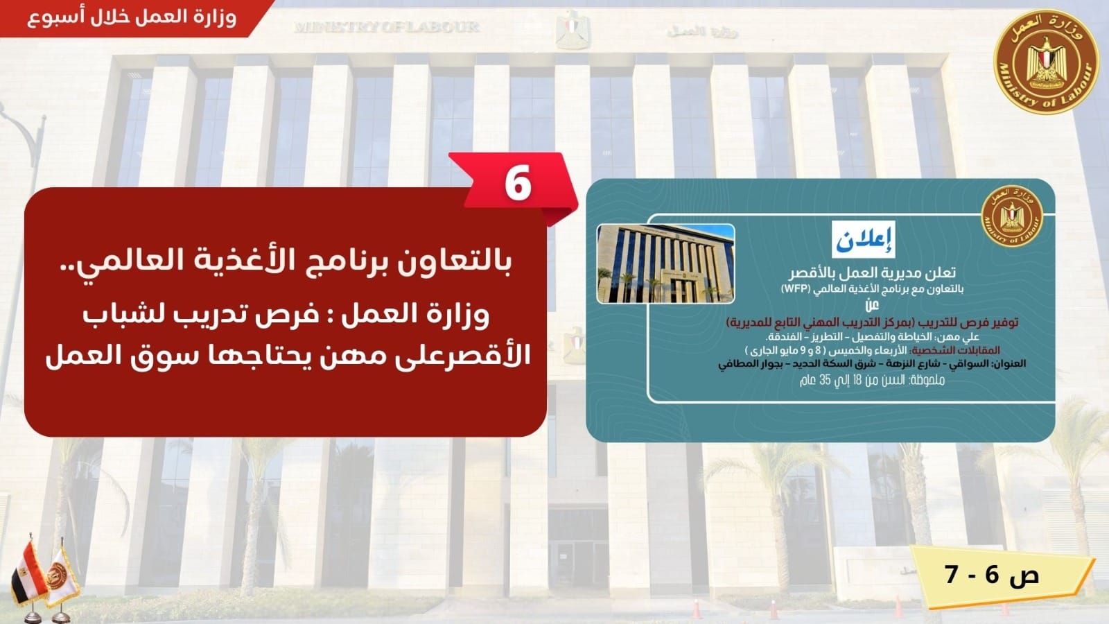 ..وأعلنت وزارة العمل عن توفير فرص للتدريب المهنى المجانى على مهن التفصيل والخياطة ، والتطريز ، وتدريب الفندقة الشاملة ،بمركز التدريب المهنى التابع لمديرية عمل الاقصر ،وذلك للشباب من الجنسين من أبناء المحافظة والمقيمين فيها الراغبين فى الحصول على برامج التدريب المتاحة ، والتى تستهدف القرى الأكثر احتياجا وأسر تكافل وكرامة وأيضا ذوى الهمم، ويشترط السن من 18 الى 35 سنة ، وتحديد موعد المقابلات الشخصية للمتقدمين يومي الأربعاء والخميس 8 و 9 مايو الماضيين ، وذلك فى إطار بروتوكول التعاون بين وزارة العمل وبرنامج الأغذية العالمى WFPالتابع لمنظمة الأمم المتحدة ، و فى ضوء جهود المديرية لتحقيق رؤية الوزارة فى إعادة تأهيل الشباب للمهن المطلوبة في سوق العمل، وإطلاق مشروع مهني 2030 ، والاستفادة من طاقاتهم وقدراتهم ومهاراتهم وتوفير العمل اللائق لهم وضخ عمالة مدربة على اعلى مستوى في سوق العمل بالشراكة مع برنامج الأغذية العالمي بهدف دعم الاقتصاد الوطني والحد ظاهرة البطالة لاسيما بين صفوف الفئات الأولى بالرعاية بقري المبادرة الرئاسية "حياة كريمة"، ومستفيدي برنامج تكافل وكرامة في محافظات صعيد مصر.