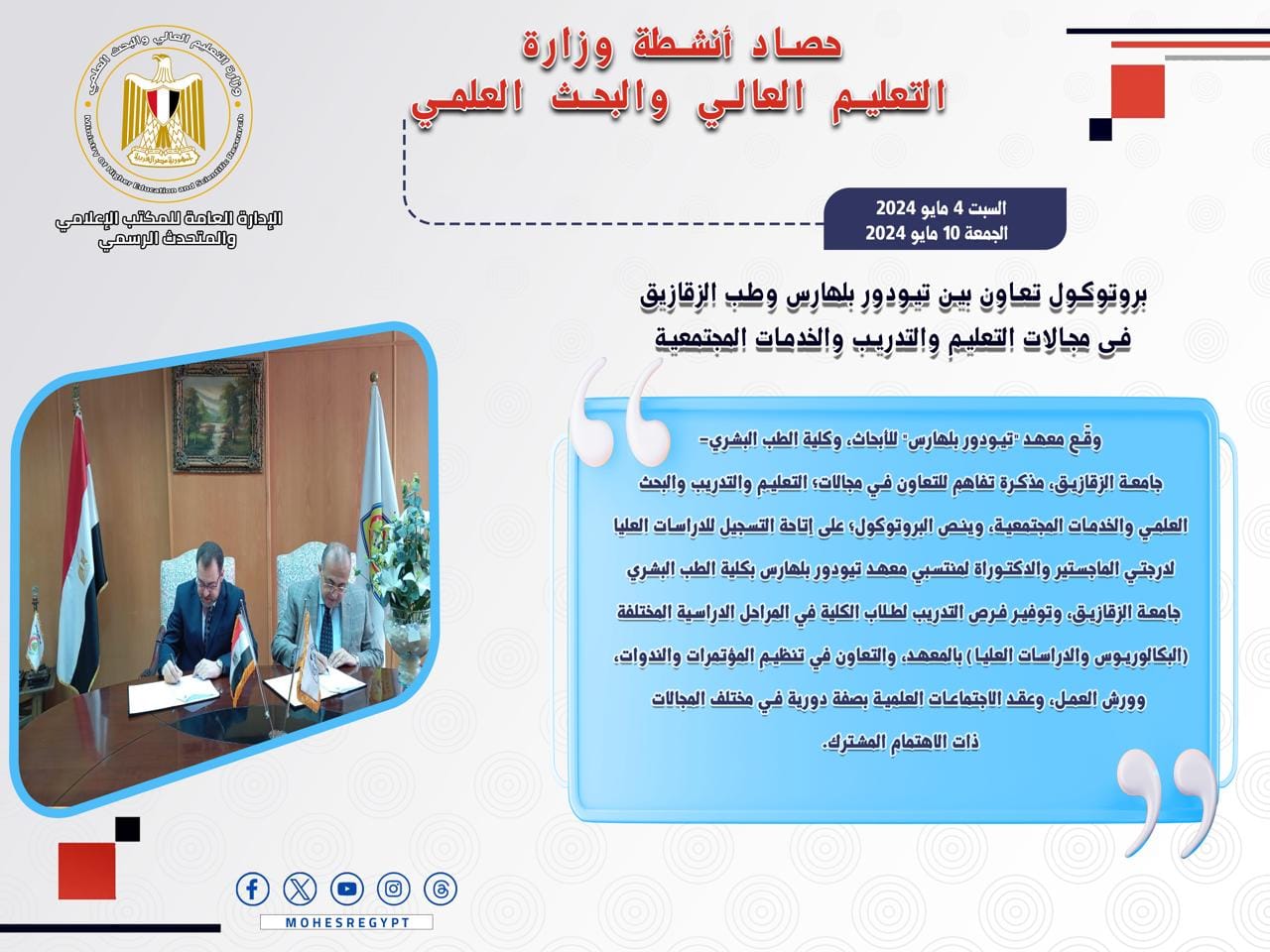 6) وقّع معهد "تيودور بلهارس" للأبحاث، وكلية الطب البشري- جامعة الزقازيق، مذكرة تفاهم للتعاون في مجالات؛ التعليم والتدريب والبحث العلمي والخدمات المجتمعية، وينص البروتوكول على إتاحة التسجيل للدراسات العليا لدرجتي الماجستير والدكتوراة لمنتسبي معهد تيودور بلهارس بكلية الطب البشري جامعة الزقازيق، وتوفير فرص التدريب لطلاب الكلية في المراحل الدراسية المختلفة (البكالوريوس والدراسات العليا) بالمعهد، والتعاون في تنظيم المؤتمرات والندوات، وورش العمل، وعقد الاجتماعات العلمية بصفة دورية في مختلف المجالات ذات الاهتمام المشترك.