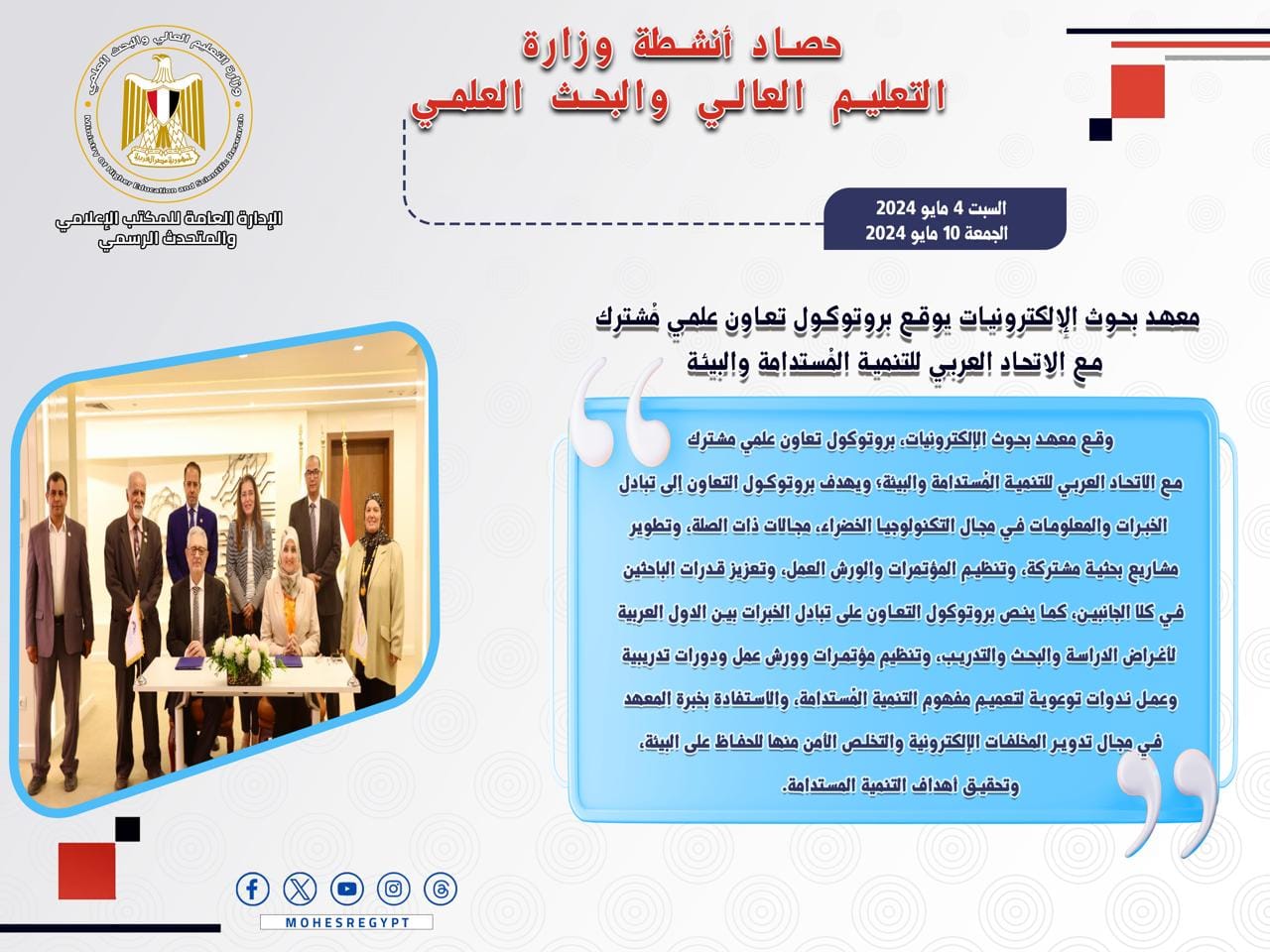 4) وقع معهد بحوث الإلكترونيات، بروتوكول تعاون علمي مشترك مع الاتحاد العربي للتنمية المُستدامة والبيئة؛ ويهدف بروتوكول التعاون إلى تبادل الخبرات والمعلومات في مجال التكنولوجيا الخضراء، مجالات ذات الصلة، وتطوير مشاريع بحثية مشتركة، وتنظيم المؤتمرات والورش العمل، وتعزيز قدرات الباحثين في كلا الجانبين، كما ينص بروتوكول التعاون على تبادل الخبرات بين الدول العربية لأغراض الدراسة والبحث والتدريب، وتنظيم مؤتمرات وورش عمل ودورات تدريبية وعمل ندوات توعوية لتعميم مفهوم التنمية المُستدامة، والاستفادة بخبرة المعهد في مجال تدوير المخلفات الإلكترونية والتخلص الأمن منها للحفاظ على البيئة، وتحقيق أهداف التنمية المستدامة.