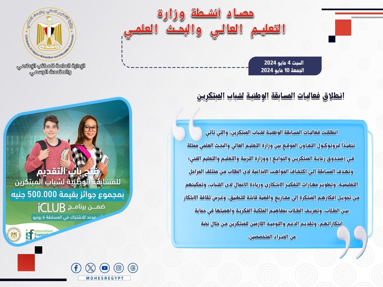 3) انطلقت فعاليات المسابقة الوطنية لشباب المبتكرين، والتي تأتي تنفيذًا لبروتوكول التعاون الموقع بين وزارة التعليم العالي والبحث العلمي ممثلة في (صندوق رعاية المبتكرين والنوابغ) ووزارة التربية والتعليم والتعليم الفني؛ وتهدف المسابقة إلى اكتشاف المواهب الإبداعية لدى الطلاب من مختلف المراحل التعليمية، وتطوير مهارات التفكير الابتكاري وريادة الأعمال لدى الشباب، وتمكينهم من تحويل أفكارهم المبتكرة إلى مشاريع واقعية قابلة للتطبيق، وغرس ثقافة الابتكار بين الطلاب، وتعريف الطلاب بمفاهيم الملكية الفكرية وأهميتها في حماية ابتكاراتهم، وتقديم الدعم والتوجيه اللازمين للمبتكرين من خلال نخبة من الخبراء المتخصصين.