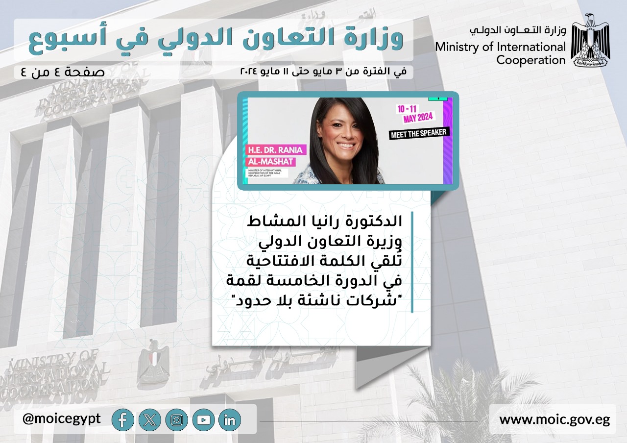 وألقت وزيرة التعاون الدولي، الكلمة الافتتاحية في الدورة الخامسة من قمة "شركات ناشئة بلا حدود"، التي تنعقد تحت عنوان "بناء آفاق عالمية"، بمشاركة 3000 من المستثمرين والمبتكرين ورواد الأعمال والمهتمين بقطاع الشركات الناشئة من جميع أنحاء العالم، ويعد منصة للتواصل الدائم بين الشركات الناشئة والمستثمرين والفاعلين في بيئة ريادة الأعمال.