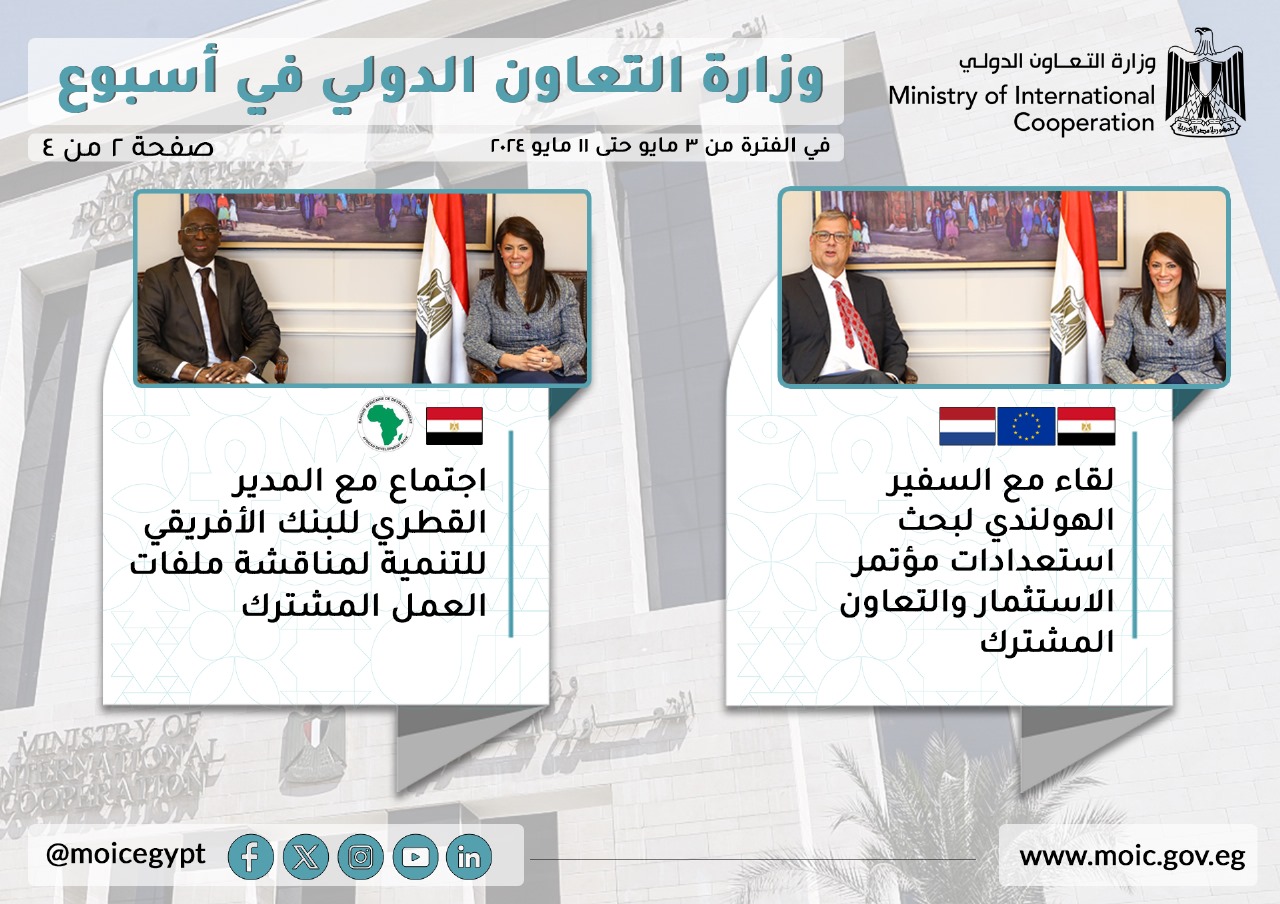 شهدت وزارة التعاون الدولي، خلال الأسبوع الماضي، العديد من الفعاليات والاجتماعات في إطار الدور الذي تقوم به الوزارة لتدعيم العلاقات الاقتصادية مع شركاء التنمية متعددي الأطراف والثنائيين، لدعم رؤية الدولة التنموية وتحفيز جهود العمل الإنمائي المشترك.
