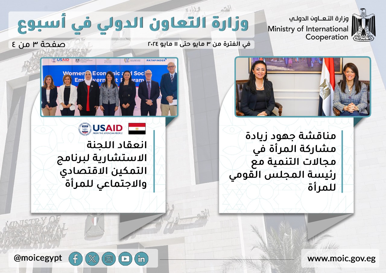 شاركت وزيرة التعاون الدولي، في اجتماع اللجنة الاستشارية لبرنامج التمكين الاقتصادي والاجتماعي للمرأة، الذي يأتي في إطار الشراكة بين وزارات التعاون الدولي، والتضامن الاجتماعي، والمجلس القومي للمرأة، والوكالة الأمريكية للتنمية الدولية USAID، ويجري تنفيذه من قبل شركة Pathfinder، مع عدد من الجهات الأخرى، ويستهدف تحسين بيئة عمل المرأة في شركات القطاع الخاص، وتوسيع نطاق الشمول المالي للعاملات بالقطاع الخاص، والحد من الآثار الاجتماعية والاقتصادية للعنف ضد المرأة. ويتم تنفيذه في الفترة من 2022-2027، في محافظات أسيوط والبحيرة والمنيا والقاهرة الكبرى (الجيزة) وسوهاج وقنا.