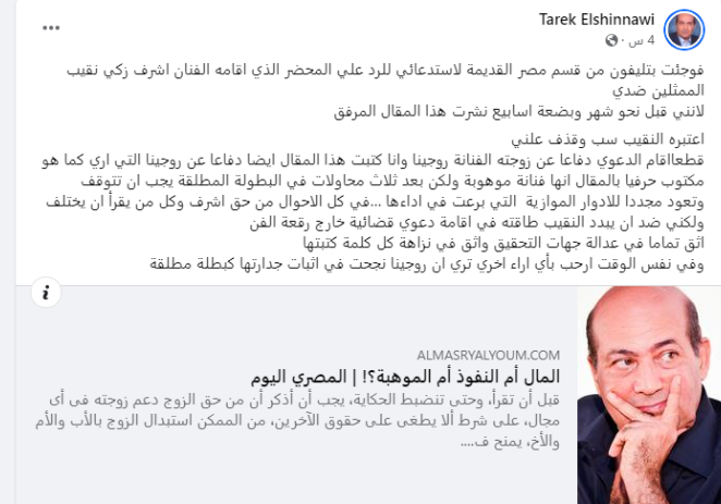 وكتب طارق الشناوي عبر حسابه بموقع التواصل الاجتماعي فيس بوك: فوجئت بتليفون من قسم مصر القديمة لاستدعائي للرد على المحضر الذي أقامه الفنان أشرف زكي نقيب الممثلين ضدي، لأنني قبل نحو شهر وبضعة أسابيع نشرت هذا المقال المرفق ولكن اعتبره النقيب سبا وقذفا علنيا.