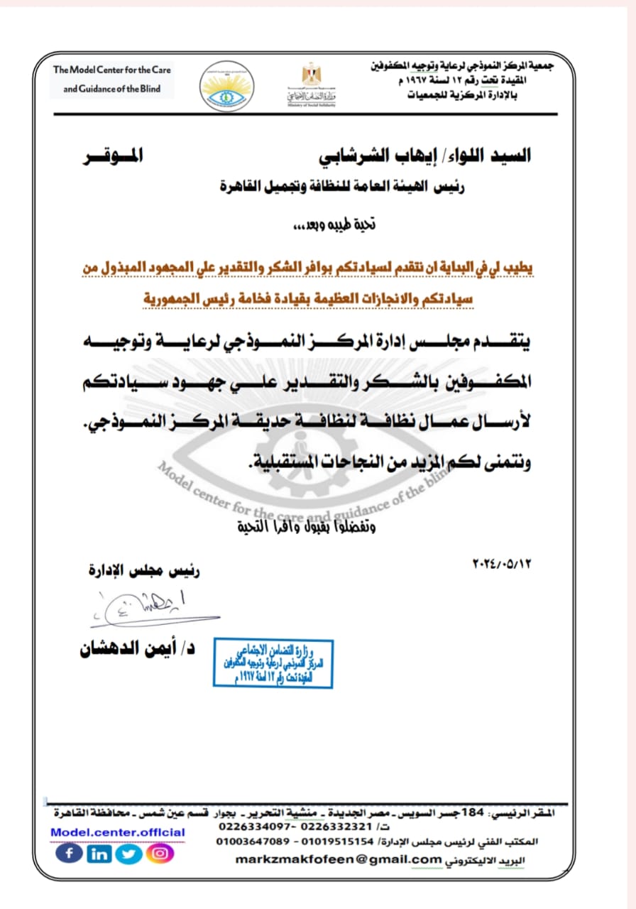 تقدم الدكتور أيمن الدهشان رئيس مجلس إدارة المركز النموذجي لرعاية وتوجيه المكفوفين بالشكر والتقديرلـ اللواء إيهاب الشرشابي رئيس الهيئة العامة للنظافة وتجميل القاهرة على الجهود المبذولة والانجازات العظيمة بقيادة الرئيس عبد الفتاح السيسي.