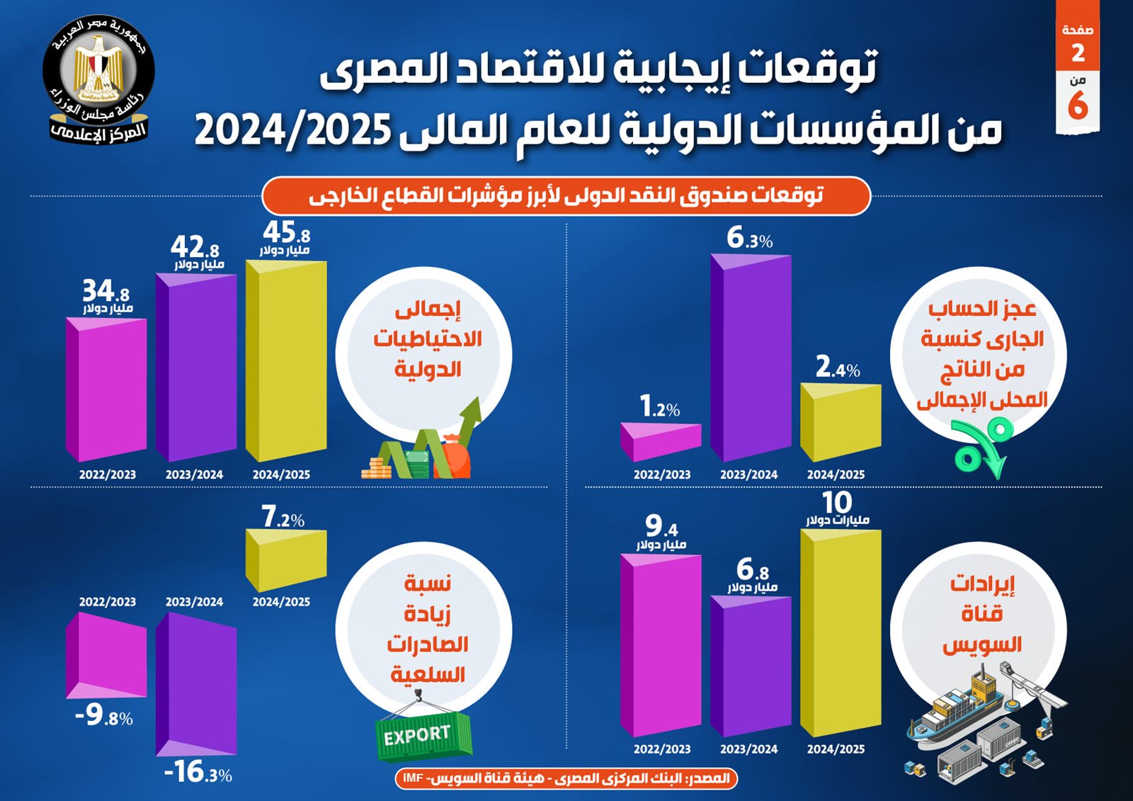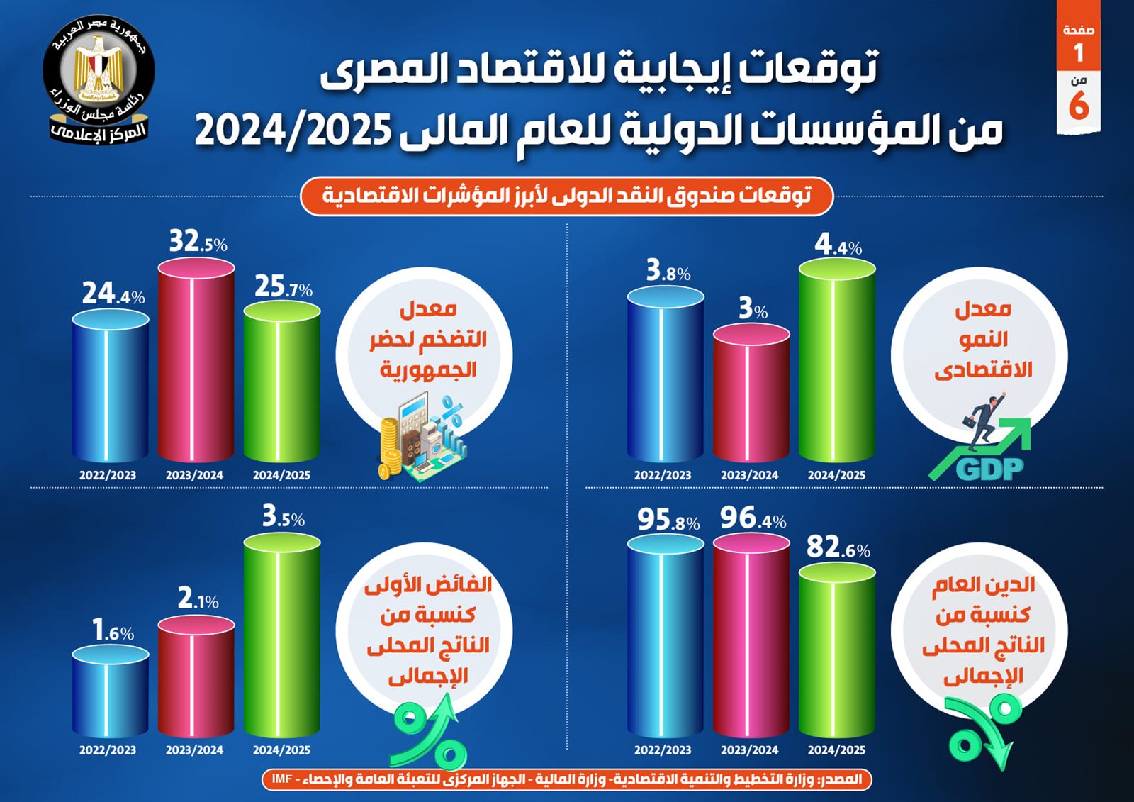 وفي هذا الصدد نشر المركز الإعلامي لمجلس الوزراء تقريراً تضمن إنفوجرافات تسلط الضوء على التوقعات الإيجابية للاقتصاد المصري من المؤسسات الدولية للعام المالي 2024/2025.