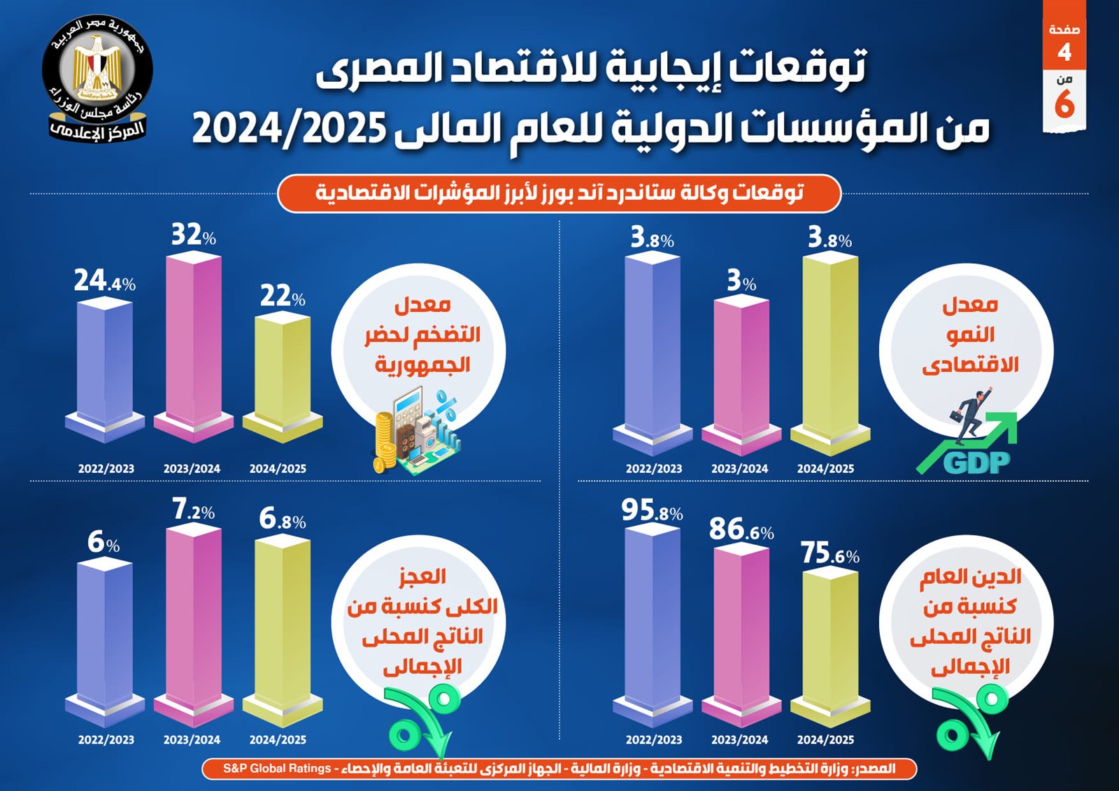 فيما توقعت الوكالة ذاتها أن يسجل الدين العام كنسبة من الناتج المحلي الإجمالي 75.6% عام 2024/2025، و86.6% عام 2023/2024، مقارنة بـ95.8% عام 2022/2023، بجانب توقعها أن ينخفض العجز الكلي كنسبة من الناتج المحلي الإجمالي ليصل إلى 6.8% عام 2024/2025، بعد أن ارتفع إلى 7.2% عام 2023/2024، مقارنة بـ6% عام 2022/2023.