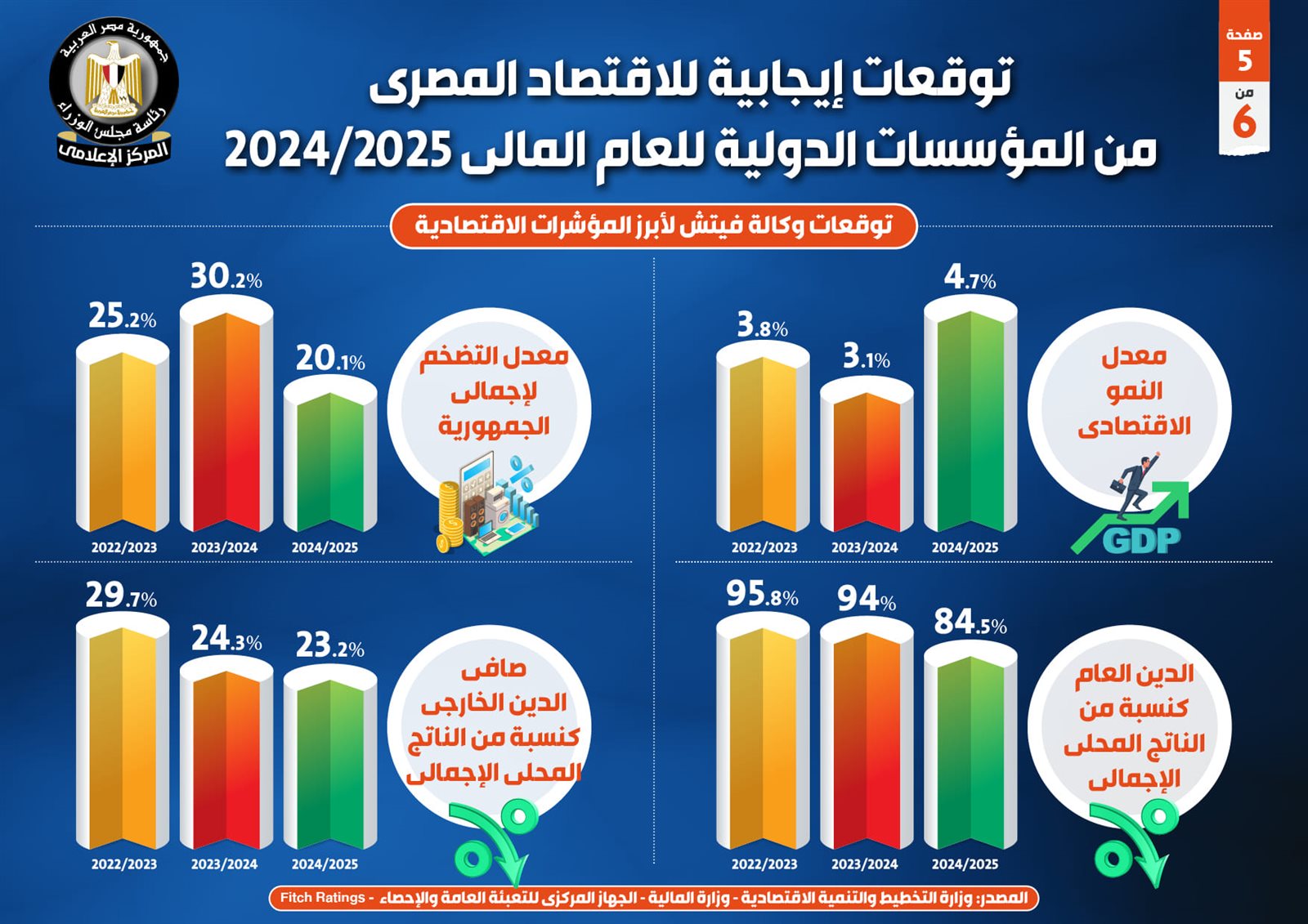وعلى صعيد ما توقعته وكالة فيتش لأبرز المؤشرات الاقتصادية، فقد توقعت زيادة معدل النمو الاقتصادي ليسجل 4.7% عام 2024/2025، بعد أن تراجع إلى 3.1% عام 2023/2024، مقارنة بـ3.8% عام 2022/2023، فضلاً عن توقعها انخفاض معدل التضخم لإجمالي الجمهورية ليسجل 20.1% عام 2024/2025، بعد ارتفاعه إلى 30.2% عام 2023/2024، مقارنة بـ25.2% عام 2022/2023.