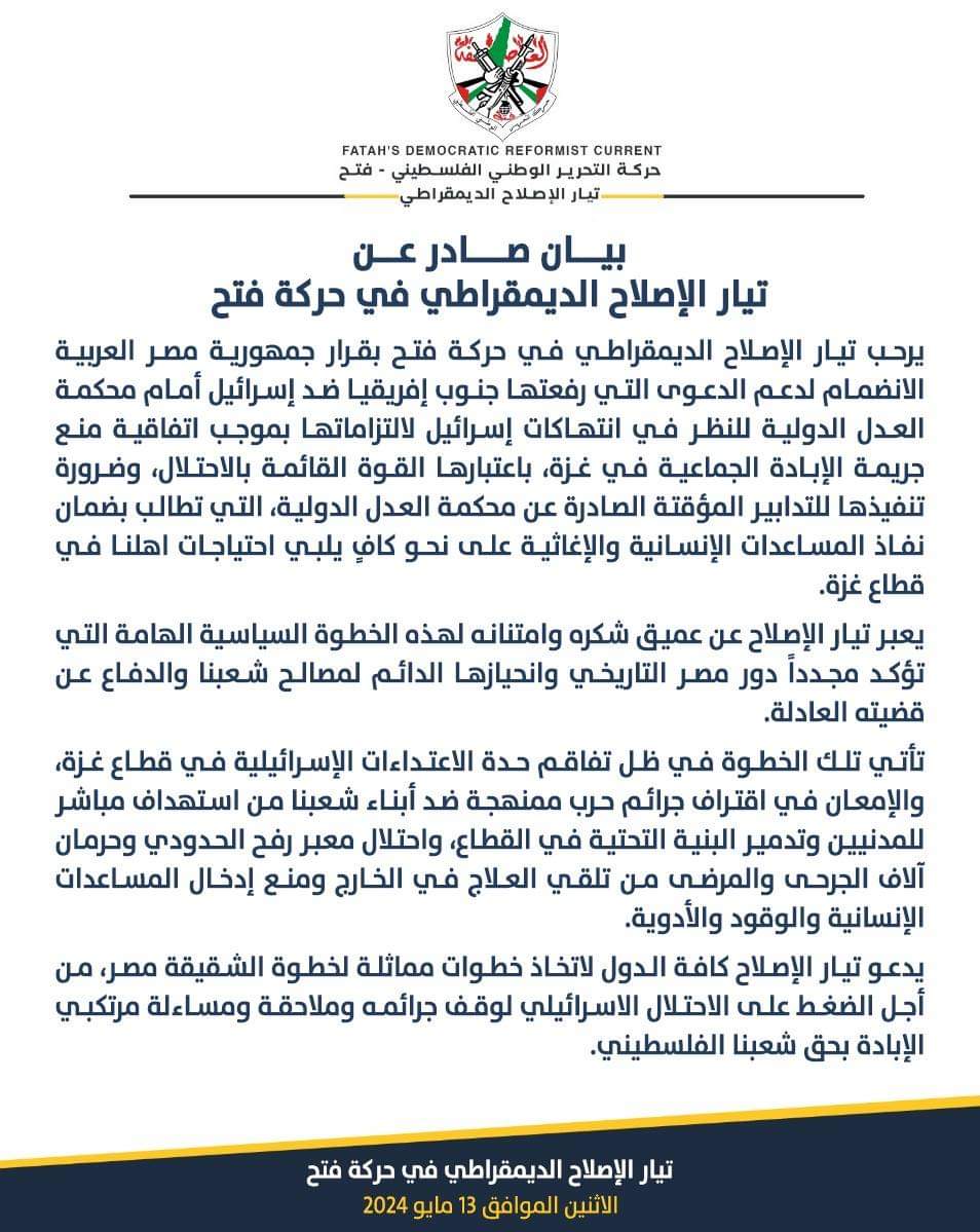 رحب تيار الإصلاح الديمقراطي في حركة فتح بقرار جمهورية مصر العربية الانضمام لدعم الدعوى التي رفعتها جنوب إفريقيا ضد إسرائيل أمام محكمة العدل الدولية للنظر في انتهاكات إسرائيل لالتزاماتها بموجب اتفاقية منع جريمة الإبادة الجماعية في غزة، باعتبارها القوة القائمة بالاحتلال، وضرورة تنفيذها للتدابير المؤقتة الصادرة عن محكمة العدل الدولية، التي تطالب بضمان نفاذ المساعدات الإنسانية والإغاثية على نحو كافٍ يلبي احتياجات اهلنا في قطاع غزة.