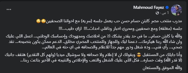 وكتب محمود فايز عبر صفحته الشخصية على موقع التواصل الاجتماعي فيسبوك، "مدرب منتخب مصر كابتن حسام حسن حب يعمل جلسه (سريه) مع اخواتنا الصحفيين ، جلسه (مغلقه) ومع صحفيين ومحرري اخبار وناقلي احداث..!!! ازاي طيب…!!! .