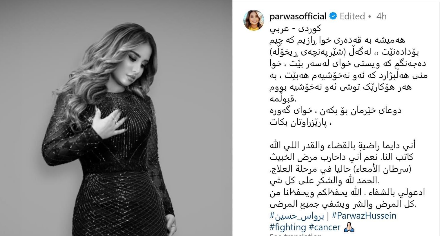 أعلنت النجمة العراقية برواس حسين، إصابتها بمرض السرطان، مشيرةً إلى أنها تخضع للعلاج حاليًّا.