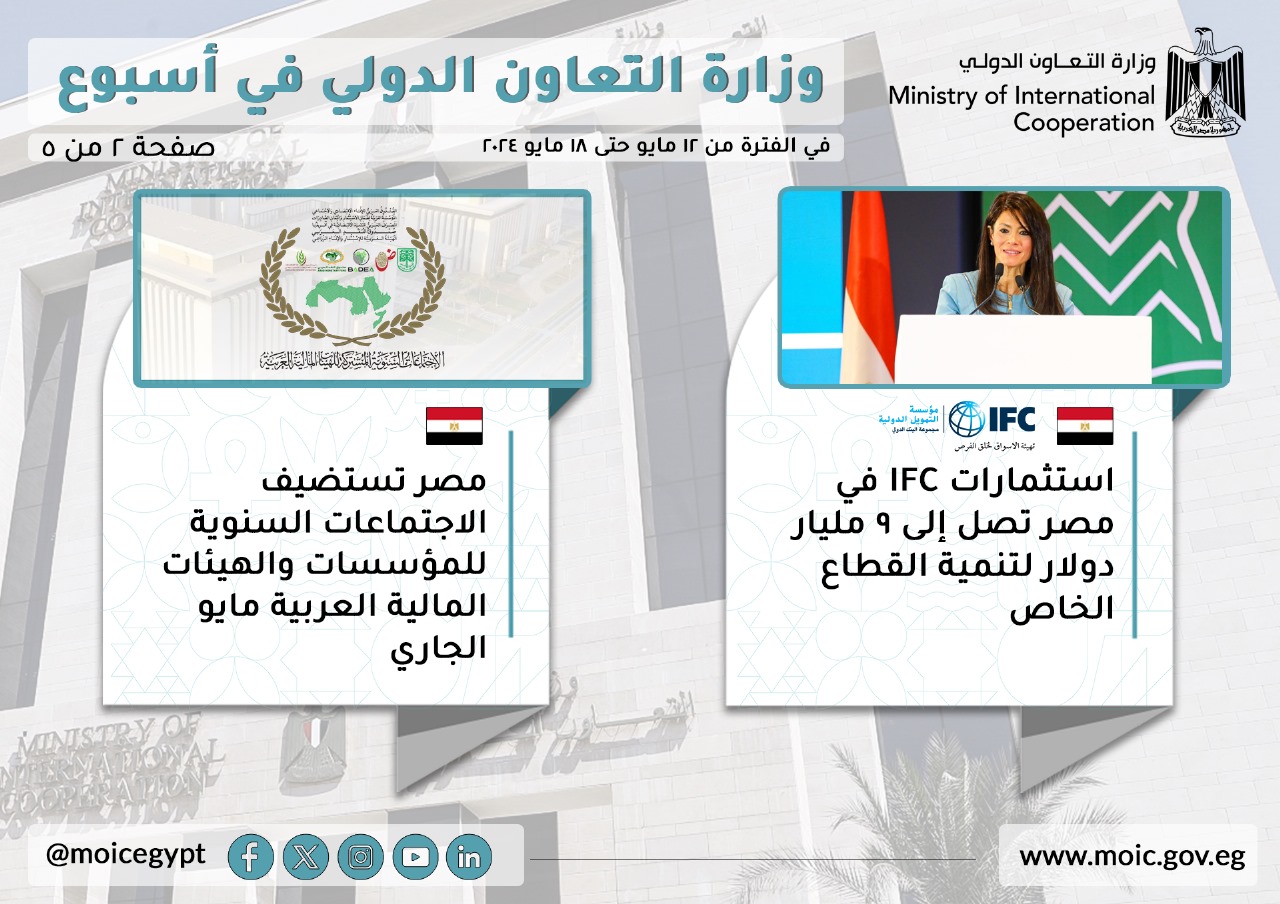 وأعلنت وزارة التعاون الدولي، استضافة مصر الاجتماعات السنوية المُشتركة للهيئات المالية العربية لعام 2024، بالعاصمة الإدارية الجديدة في 22 مايو الجاري، تحت رعاية السيد الرئيس عبد الفتاح السيسي، رئيس جمهورية مصر العربية، وذلك في ضوء حرص الدولة المصرية على دعم ومساندة جهود مختلف المؤسسات والهيئات المالية العربية لتحقيق رسالتها التنموية، ودعم العمل العربي المشترك، وتعزيز جهود التنمية في مختلف الدول العربية.