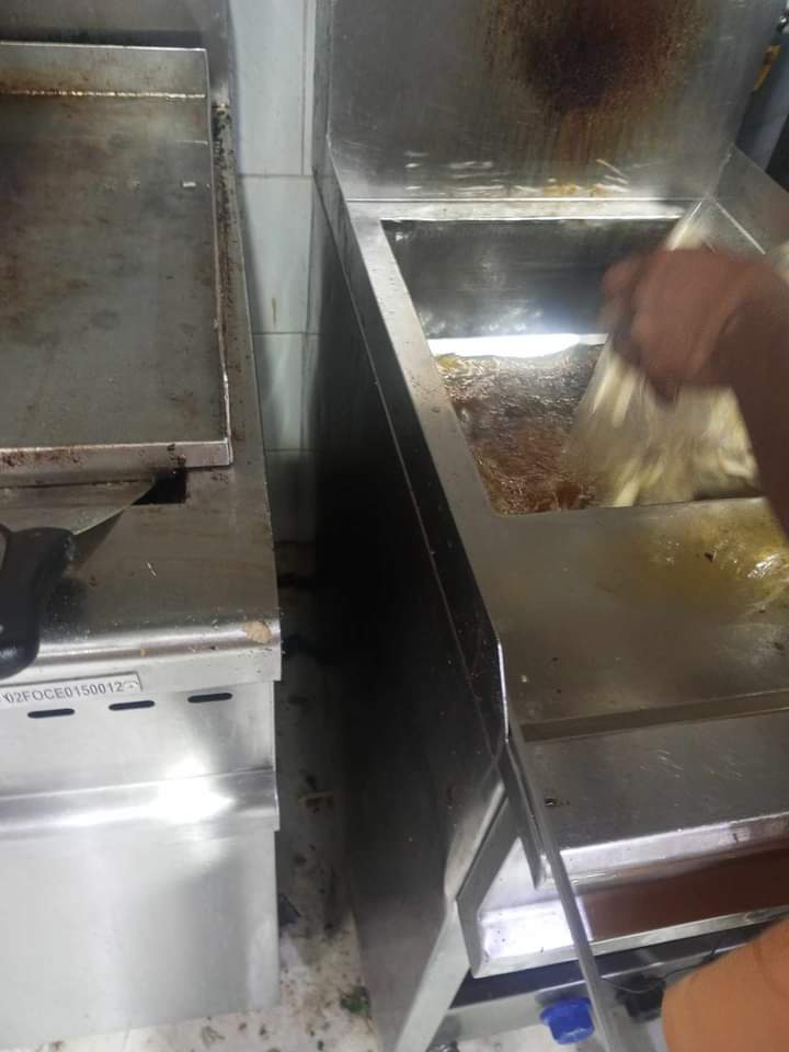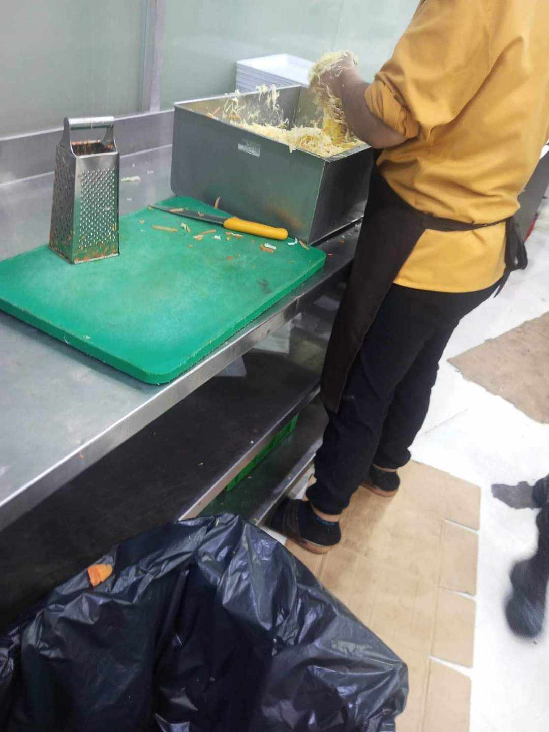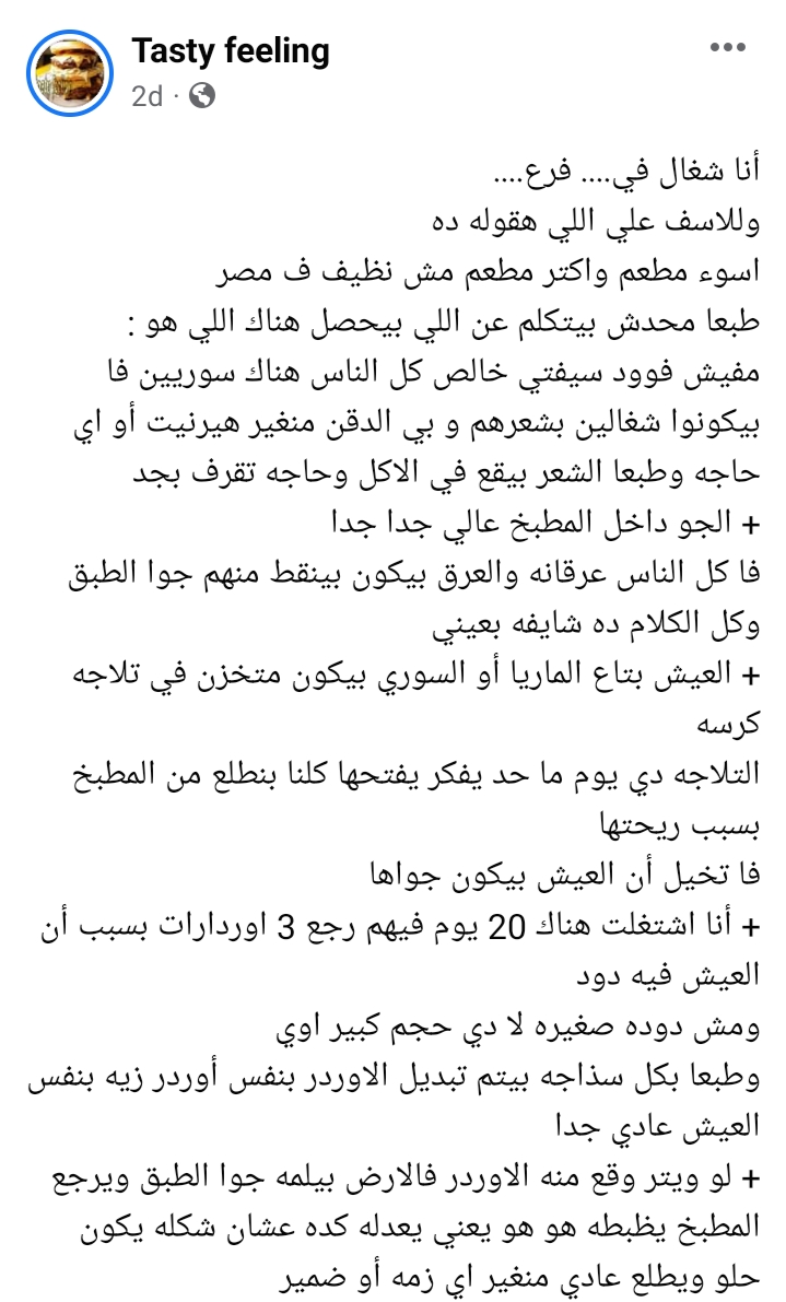 وواصل: “كل الويتر أو الشيف عنده صلاحيه يمد أيده في أي طبق ايا كان الطبق.. وتلاقي الويتر اللي بيكون لسا راجع من الحمام يمد ايده فالطبق ياخد شويه بطاطس أو ياخد حته شاورما ومحدش بيتكلم عادي.. ولا يتم تنظيف الأرض أو الادوات غير مره واحده بس بعد انتهاء العمل يعني 2 بليل غير كده لا “.