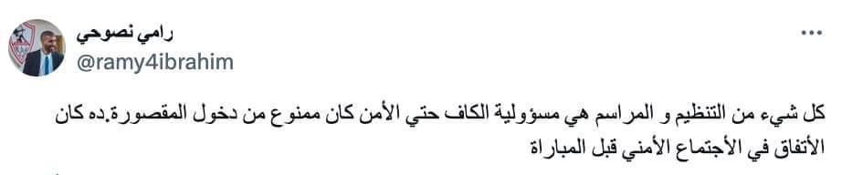 وقال رامي نصوحي من خلال حسابه الرسمي على مواقع التواصل الاجتماعي“ فيسبوك”: "كل شيء من التنظيم والمراسم هي مسؤولية الكاف، حتى الامن كان ممنوع من دخول المقصورة، ده كان الاتفاق في الاجتماع الامني قبل انطلاق المباراة".