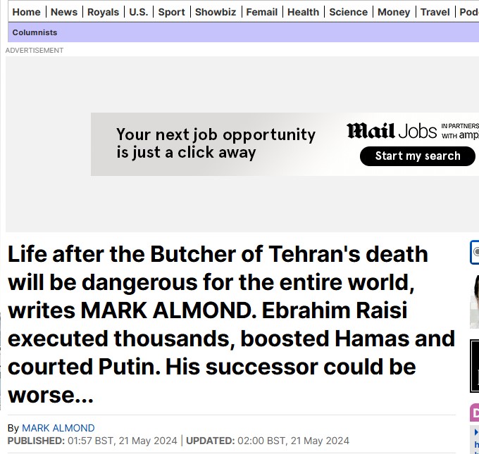 ذكرت صحيفة “ ديلي ميل ”البريطانية في تقرير لها "أن الحياة بعد وفاة جزار طهران خطيرة على العالم بأسره،حيث أشارت إلي أن إبراهيم رئيسي قام بإعدام آلاف الأشخاص، وزاد من دعم حماس وطلب التقارب مع بوتين. قد يكون خليفته أسوأ بكثير.