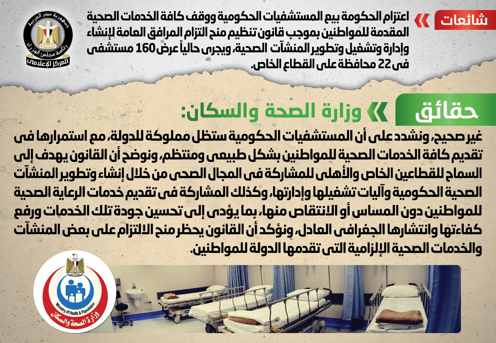 ويجري حالياً عرض160 مستشفى في 22محافظة على القطاع الخاص، وقد قام المركز الإعلامي لمجلس الوزراء بالتواصل مع وزارة الصحة والسكان، والتي نفت تلك الأنباء، مُؤكدةً أنه لا صحة لاعتزام الحكومة بيع المستشفيات الحكومية ووقف كافة الخدمات الصحية المقدمة للمواطنين بموجب قانون تنظيم منح التزام المرافق العامة لإنشاء وإدارة وتشغيل وتطوير المنشآت الصحية، مشددةً على أن المستشفيات الحكومية ستظل مملوكة للدولة، مع استمرارها في تقديم كافة الخدمات الصحية للمواطنين بشكل طبيعي ومنتظم، موضحةً أن القانون يهدف إلى السماح للقطاعين الخاص والأهلي للمشاركة في المجال الصحي من خلال إنشاء وتطوير المنشآت الصحية الحكومية وآليات تشغيلها وإدارتها، وكذلك المشاركة في تقديم خدمات الرعاية الصحية للمواطنين دون المساس أو الانتقاص منها، بما يؤدي إلى تحسين جودة تلك الخدمات ورفع كفاءتها وانتشارها الجغرافي العادل، مؤكدةً أن القانون يحظر منح الالتزام على بعض المنشآت والخدمات الصحية الإلزامية التى تقدمها الدولة للمواطنين.