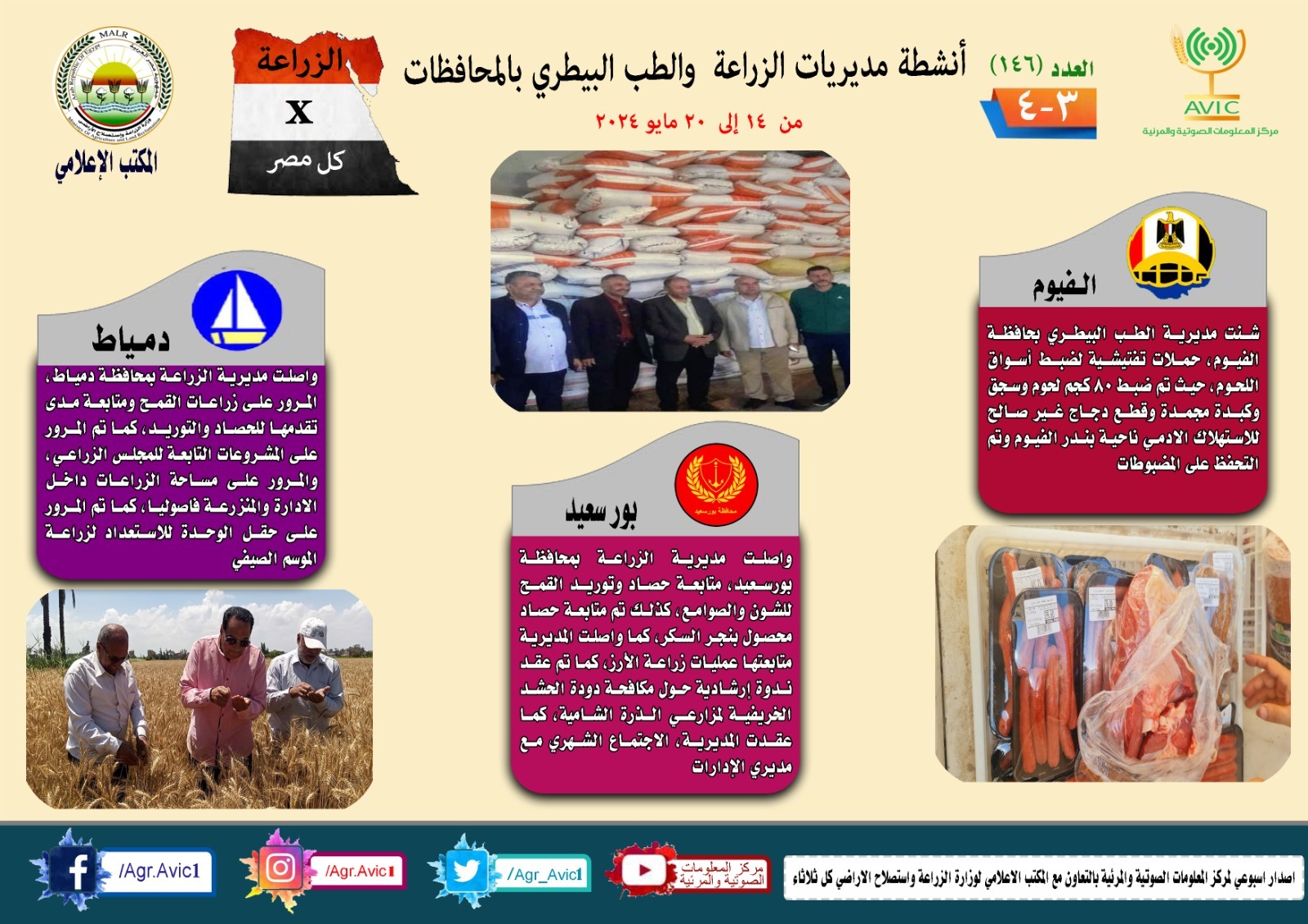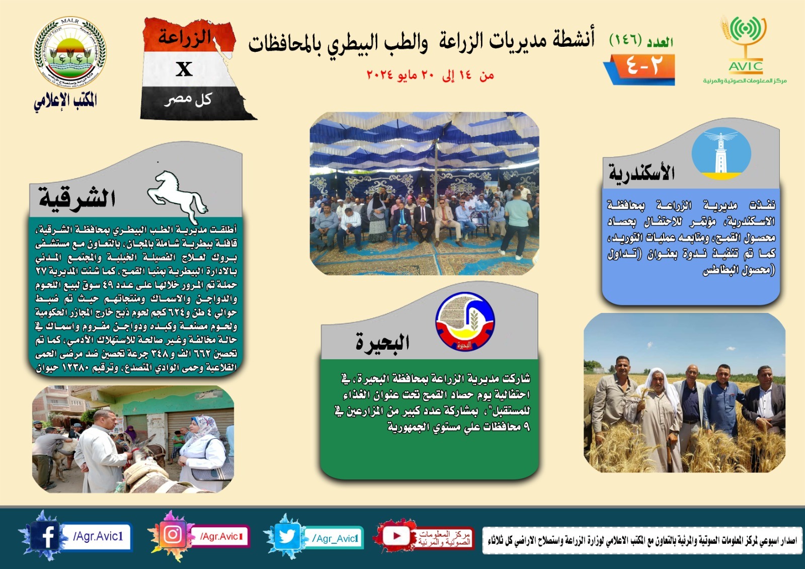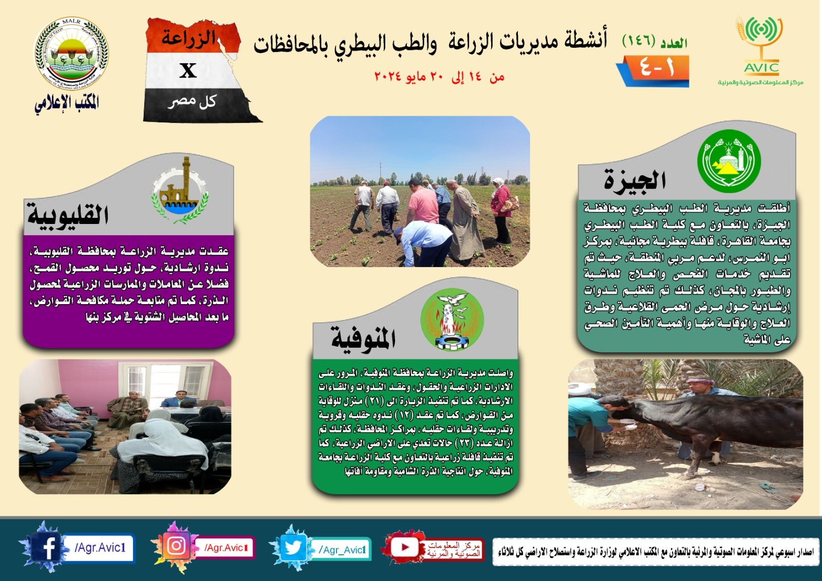 أصدر مركز المعلومات الصوتية والمرئية التابع لوزارة الزراعة واستصلاح الأراضي، والمكتب الاعلامي للوزارة، العدد رقم ١٤٦ من اصدار: "الزراعة في كل مصر" بالانفوجراف والفيديو، يوضح الجهود والانشطة التي تقوم بها مديريات الزراعة والطب البيطري بمحافظات الجمهورية خلال الفترة من ١٤ وحتى ٢٠ مايو الجاري.
