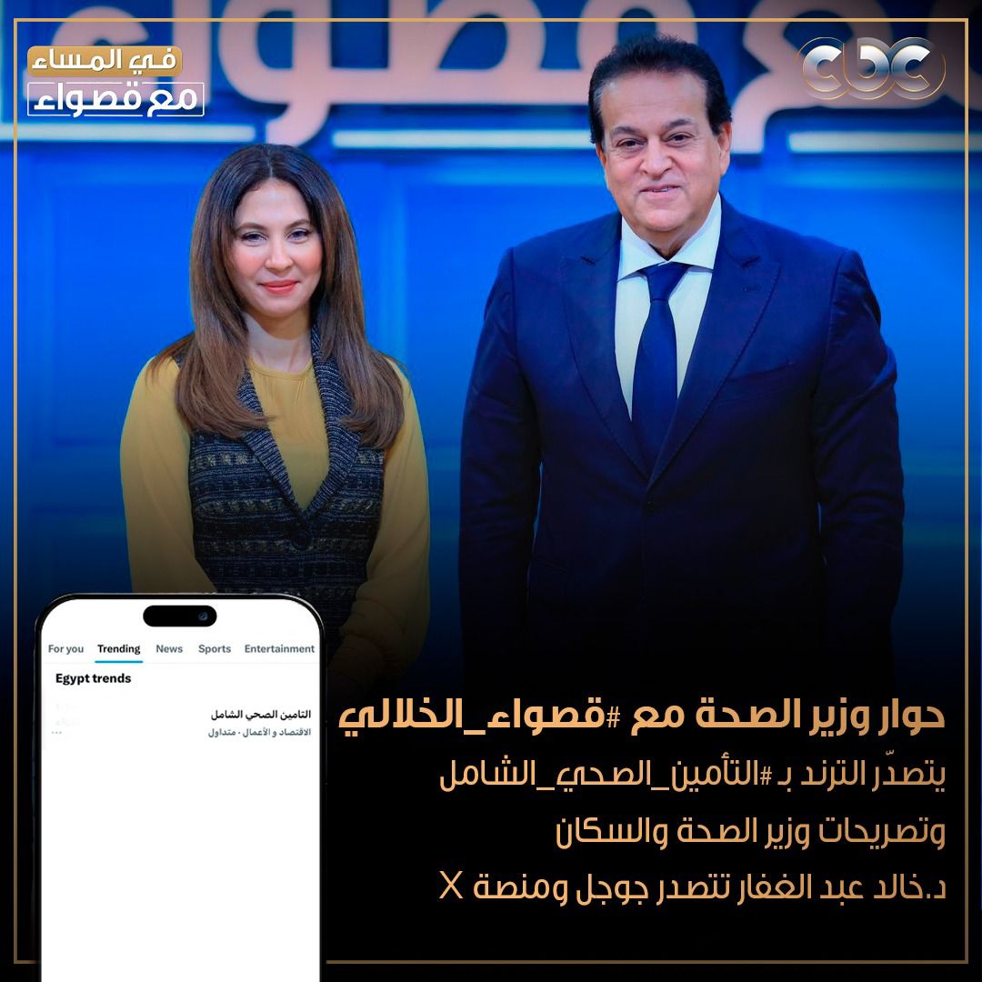 تصدر حوار وزير الصحة الدكتور خالد عبدالغفار مع الإعلامية قصواء الخلالي في برنامج "في المساء مع قصواء" على قناة "CBC"، الترند بوسم التأمين الصحي الشامل وكلمات بحثية أخرى على موقع البحث الأشهر جوجل ومنصة X.