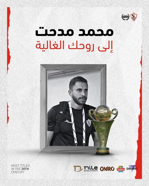 ونشرت الصفحة الرسمية لنادى الزمالك عبر "فيسبوك" صورة لمحمد مدحت المعد البدنى الفريق مع كأس الكونفدرالية معلقة عليها:" إلى روحك الغالية".