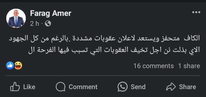 وأعرب المهندس فرج عامر عبر حسابه الرسمي بـ منصة “فيسبوك” قائلًا:" الكاف متحفز لاعلان عقوبات مشددة، بالرغم من كل الجهود اللي بُذلت من اجل تخفيف العقوبات التي تسببت فيها الفرحة".