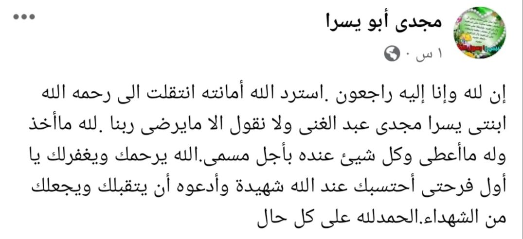وكتب والد يسرا مجدي ضحية ميكروباص معدية أبو غالب على صفحته الشخصية على موقع التواصل الاجتماعي فيسبوك: إنا لله وإنا إليه راجعون، استرد الله أمانته انتقلت إلى رحمه الله ابنتي يسرا مجدي عبد الغني، ولا نقول إلا ما يرضي ربنا، لله ما أخذ وله ما أعطى وكل شيء عنده بأجل مسمى.، الله يرحمك ويغفرلك يا أول فرحتي، أحتسبك عند الله شهيدة وأدعوه أن يتقبلك ويجعلك من الشهداء الحمد لله على كل حال.