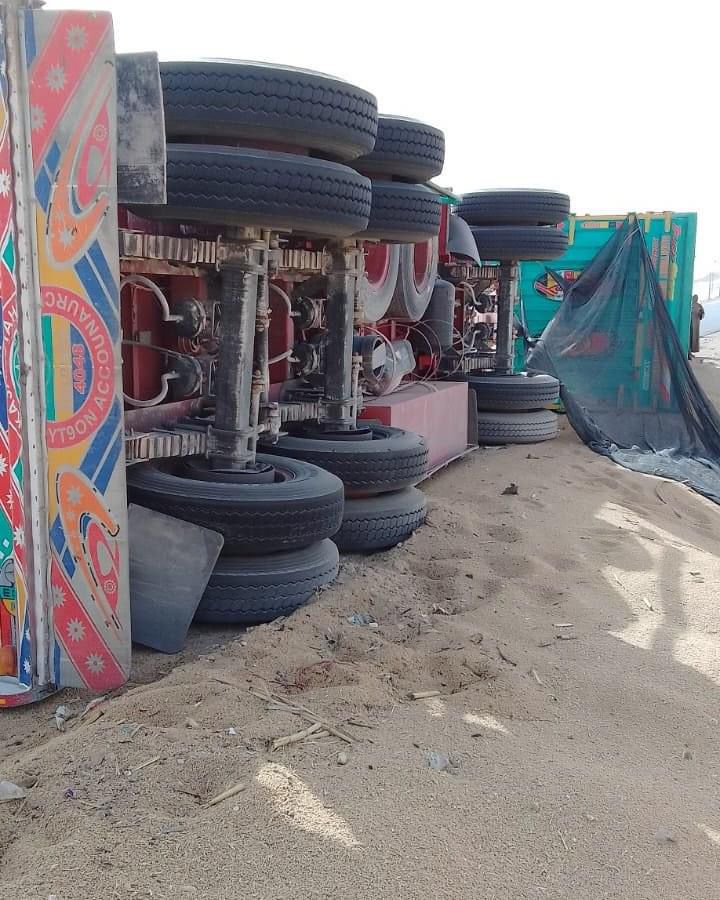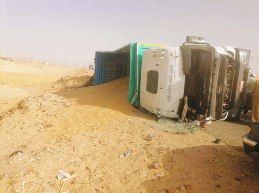 أصيب شخصان، في حادث انقلاب شاحنة نقل كبيرة محملة بـ 92 طن قمح على الطريق الصحراوي الغربي بنطاق محافظة المنيا.
