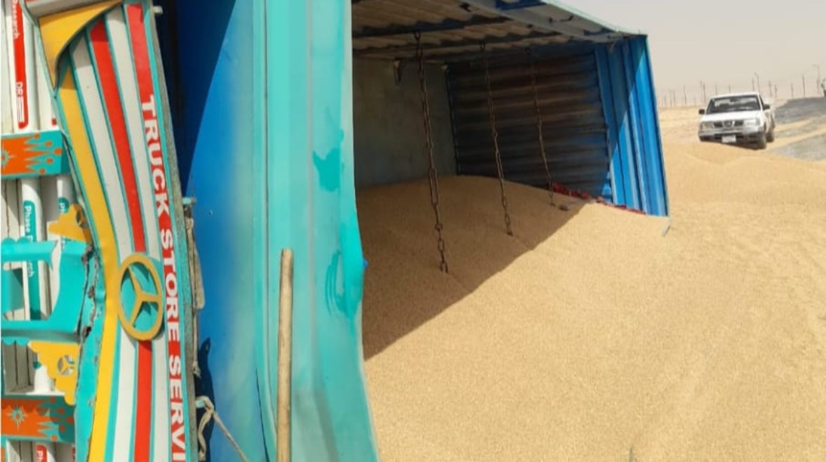 92 طن قمح على الأسفلت.. انقلاب مقطورة محملة بالغلال على الطريق الصحراوي بالمنيا