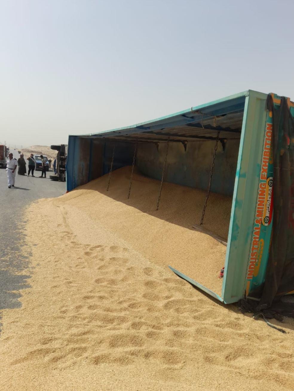 وبانتقال رجال الشرطة وسيارات الإسعاف إلي مكان الحادث، تبين انقلاب شاحنة نقل مقطورة محملة بـ92 طنًا من القمح قادمة من شرق العوينات إلى صوامع المنيا الجديدة.