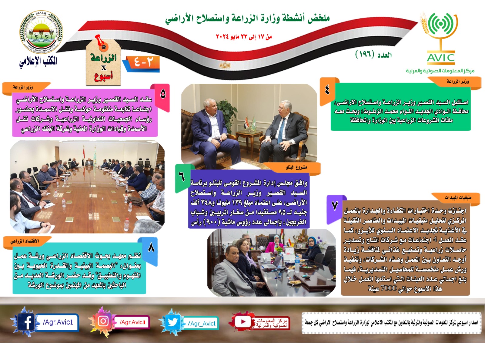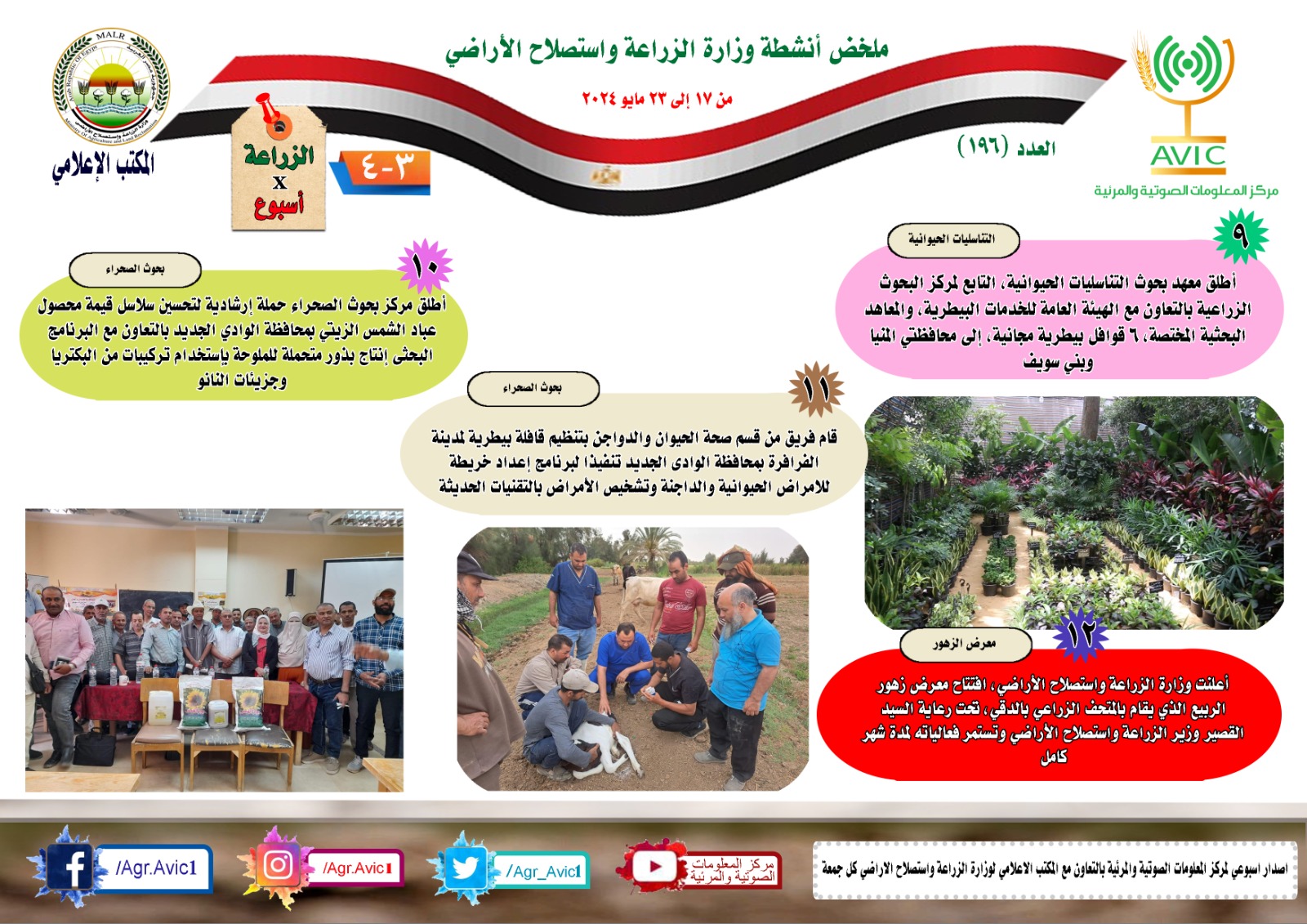 أصدر مركز المعلومات الصوتية والمرئية، التابع لوزارة الزراعة واستصلاح الاراضي، "الانفوجراف الاسبوعي" في نسخته رقم 196 حول الحصاد الاسبوعي لأهم أنشطة الوزارة، خلال الاسبوع الماضي في الفترة من 17 وحتى 23 مايو الجاري، وذلك بالتعاون مع المكتب الاعلامي للوزارة، كما أصدر المركز ايضا ملخصا بالفيديو، حول انشطة الوزارة خلال نفس الفترة.