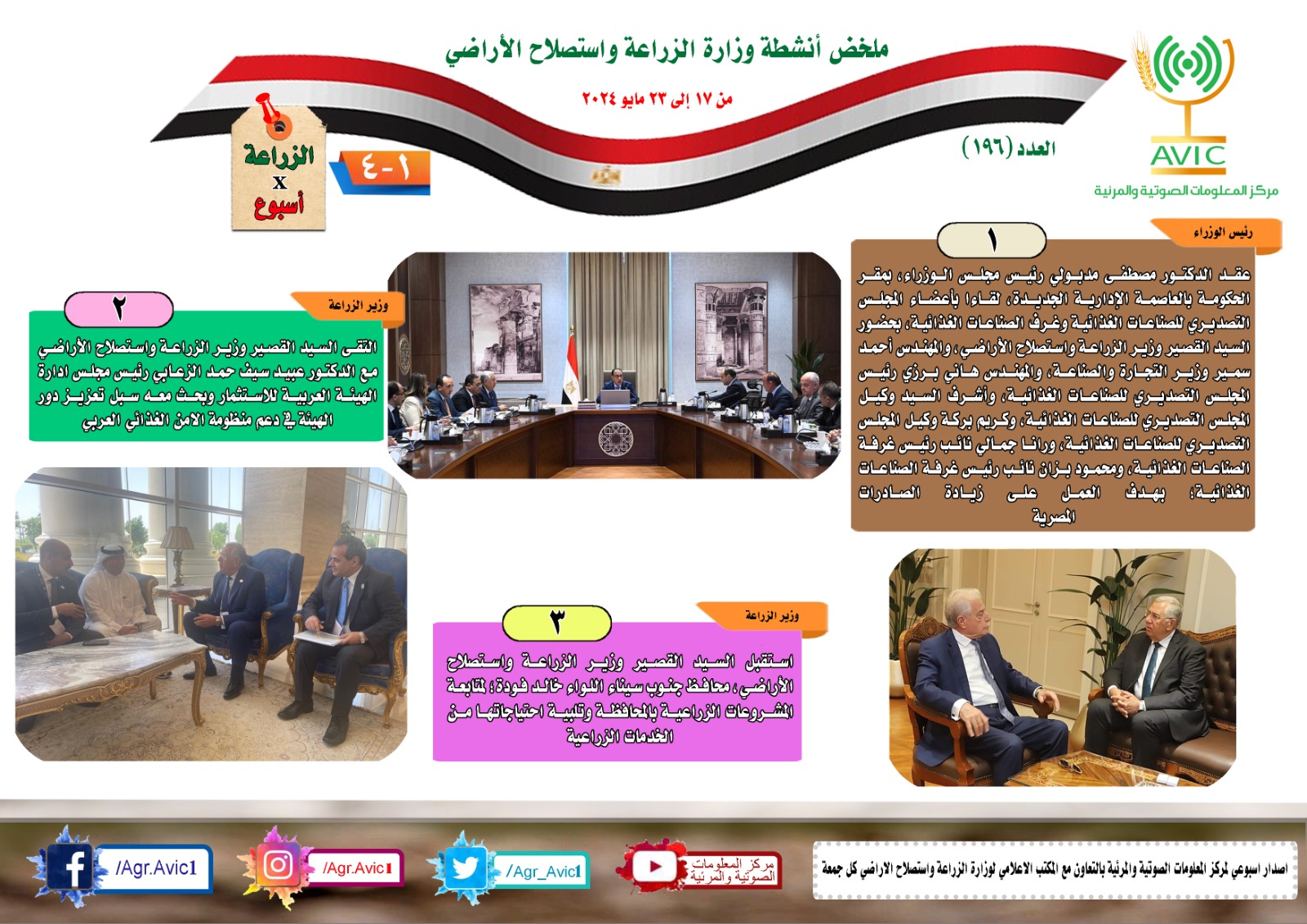 "الزراعة في أسبوع" نشرة الحصاد رقم 169 لأنشطة الوزارة في الفترة من 17 وحتى 23 مايو الجاري