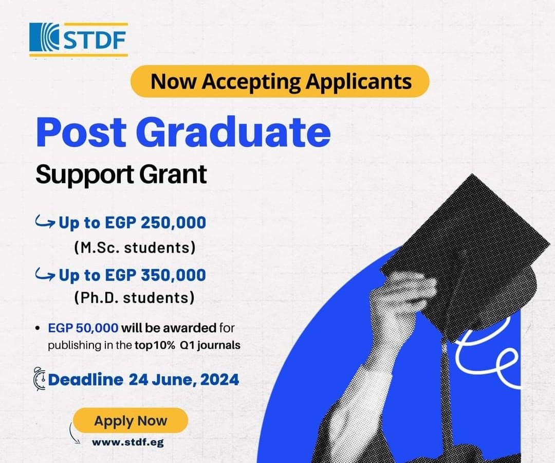 تعلن هيئة تمويل العلوم والتكنولوجيا والابتكار (STDF) عن فتح باب التقدم للنداء الثالث؛ لتمويل طلاب الدراسات العليا (ماجستير – دكتوراه)؛ بغرض تحفيز ودفع عجلة البحث العلمي وبناء قدرات شباب الباحثين في المجالات العلمية وإعداد كوادر قادرة على الارتقاء بمستوى البحث العلمي في مصر.