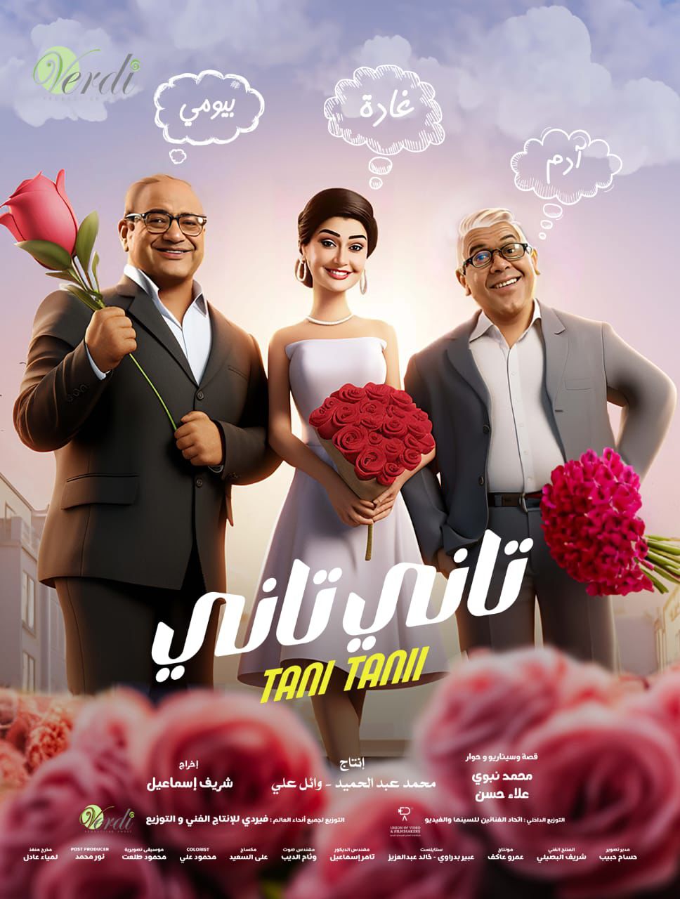 فيلم "تانى تانى" بطولة غادة عبد الرازق، أحمد آدم، بيومى فؤاد، محمود حافظ، ثراء جبيل، دنيا ماهر، أمير صلاح الدين، سليمان عيد، إبرام سمير، إسلام شوقي وعدد آخر من الفنانين ومن تأليف محمد نبوى وعلاء حسين وإخراج شريف إسماعيل وإنتاج شركة فيردي للمنتجين محمد عبد الحميد ووائل علي.