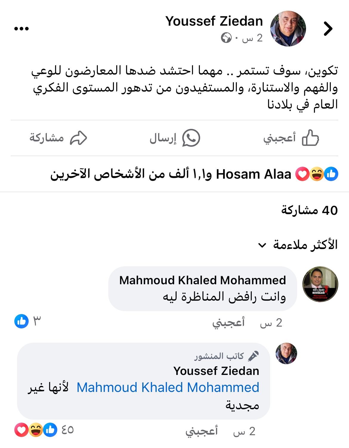 وعلق أحد المتابعين على منشور الكاتب يوسف زيدان قائلا: “وانت رافض المناظرة ليه؟” ليرد عليه زيدان قائلا : “لأنها غير مجدية”.