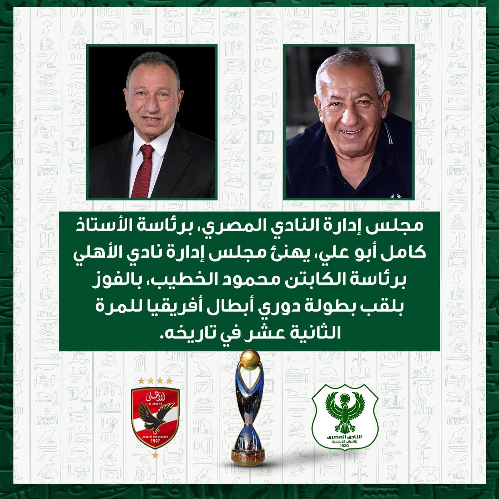 قام مجلس إدارة النادي المصري، برئاسة الأستاذ كامل أبو علي، بتهنئة مجلس إدارة نادي الأهلي برئاسة الكابتن محمود الخطيب، بالفوز بلقب بطولة دوري أبطال أفريقيا للمرة الثانية عشر في تاريخه.