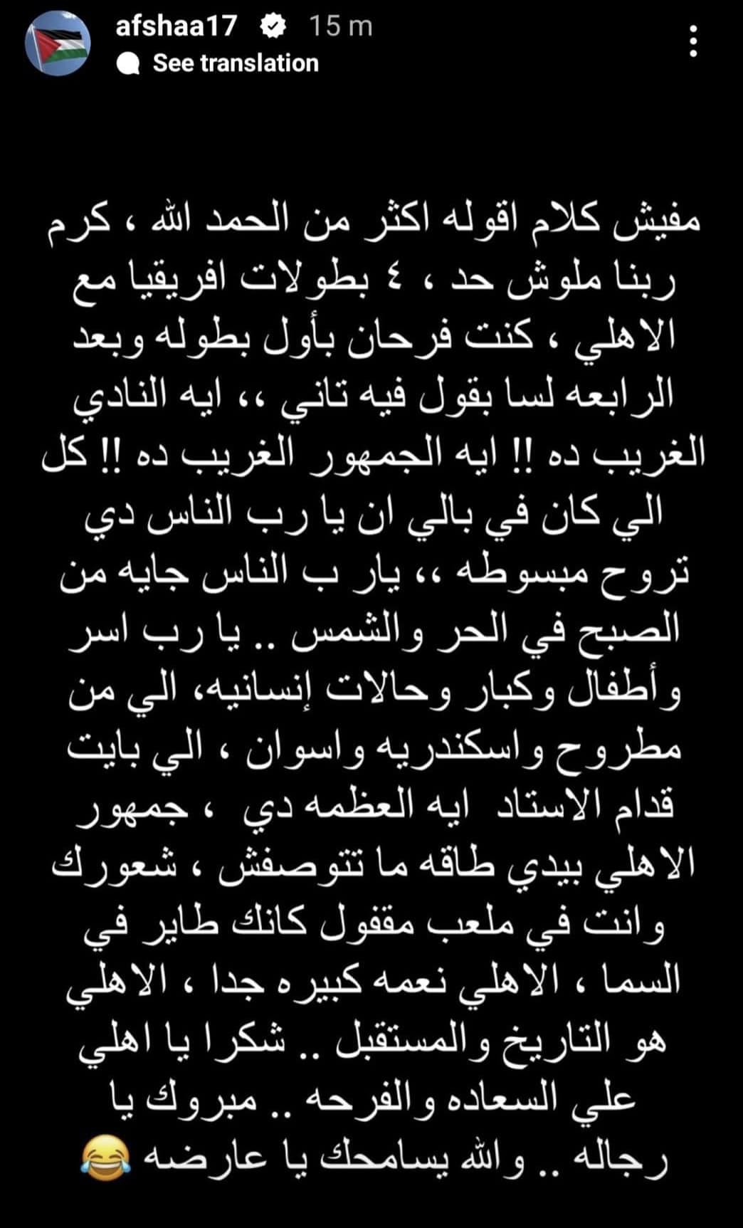 “مفيش كلام أقوله أكثر من الحمد لله، كرم ربنا ملوش حد، 4 بطولات إفريقيا مع الاهلي، كنت فرحان بأول بطولة وبعد الرابعة لسه بقول فيه تاني،، ايه النادي الغريب ده، ايه الجمهور الغريب ده، كل اللي كان في بالي ان يارب الناس دي تروج مبسوطة، يارب الناس جايه من الصبح في الحر والشمس، يارب أسر وأطفال وكبار وحالات إنسانية، اللي من مطروح واسكندرية وأسوان، اللي بايت قدام الاستاد، ايه العظمه دي، جمهور الأهلي بيدي طاقة متتوصفش، شعورك وانت في الملعب مقفول كأنك طاير في السما، الأهلي نعمة كبيرة جدا، الأهلي هو التاريخ والمستقبل، شكرا يا أهلي على السعادة والفرحة,, مبروك يا رجالة، والله يسامحك يا عارضة”.