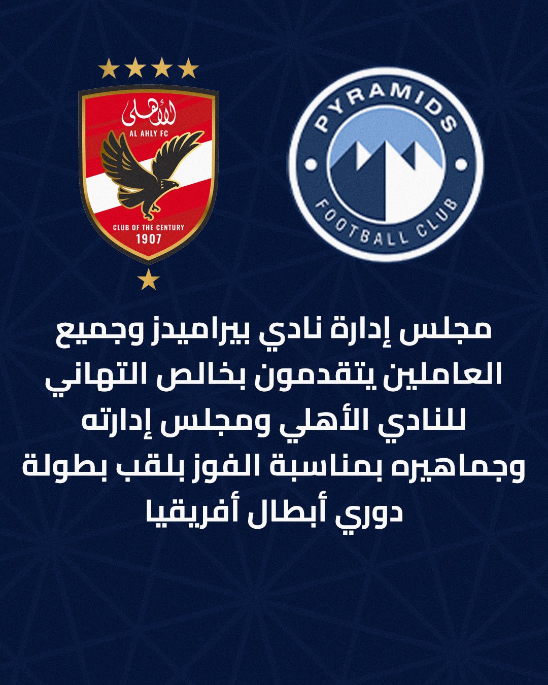 قدم نادي بيراميدز التهئنة للنادي الأهلي بعد التتويج بلقب دوري أبطال إفريقيا للمرة الثانية عشر في تاريخه، على حساب الترجي التونسي.