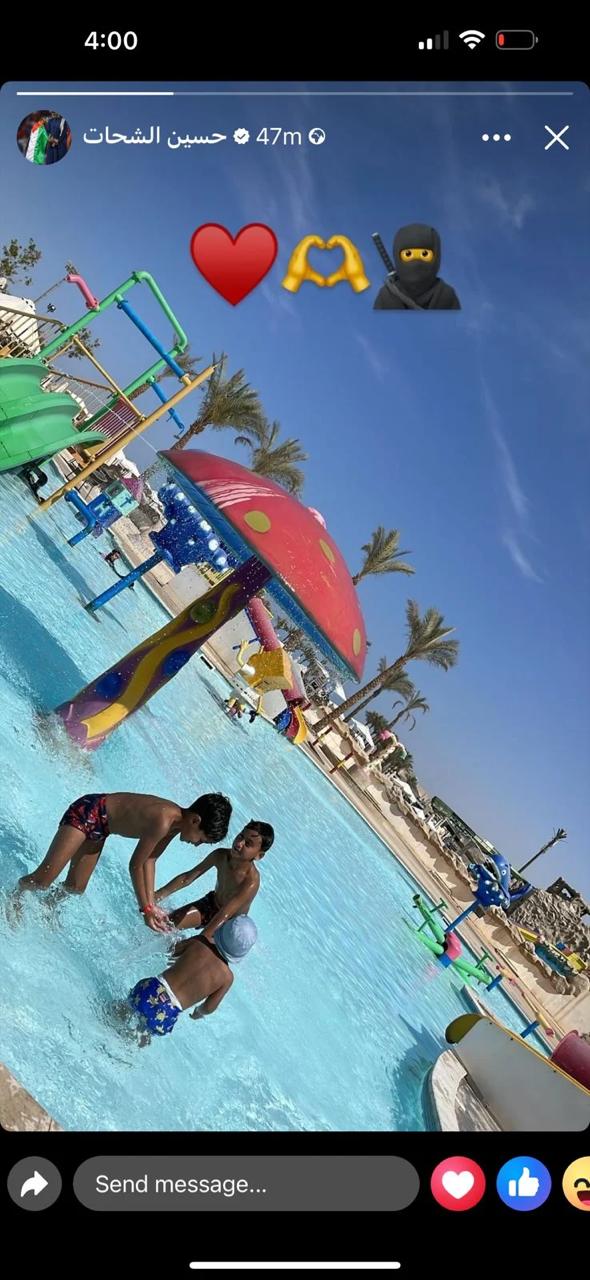 نشر حسين الشحات لاعب الأهلي صورة لآبنائه أثناء الاستمتاع بإجازة معهم في حمام السباحة، قبل استئناف التدريبات الجماعية لفريقه.