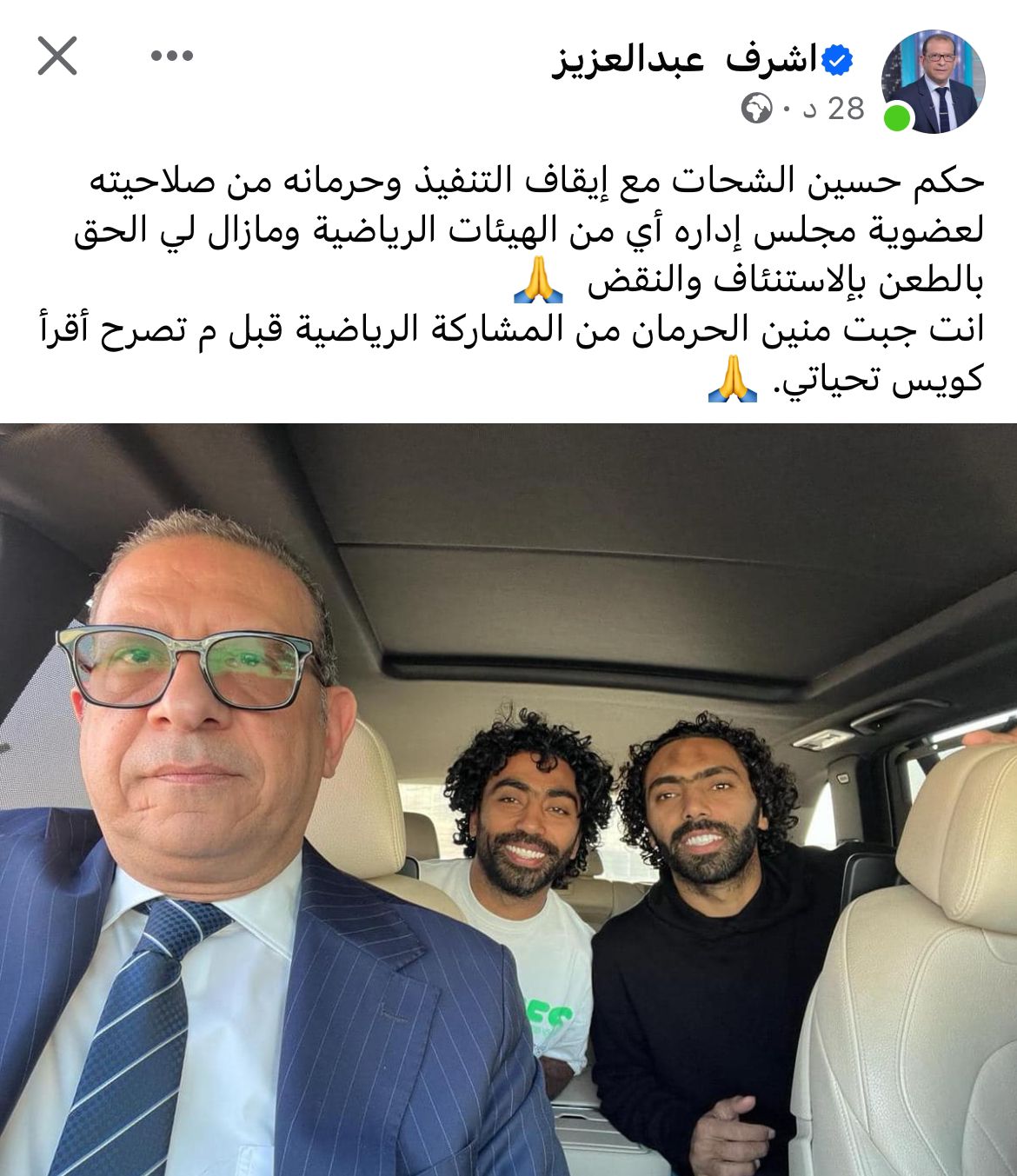 وكتب عبد العزيز من خلال حسابه الشخصي فيس بوك:"حكم حسين الشحات مع إيقاف التنفيذ وحرمانه من صلاحيته لعضوية مجلس إداره أي من الهيئات الرياضية ومازال لي الحق بالطعن بإلاستنئاف والنقض